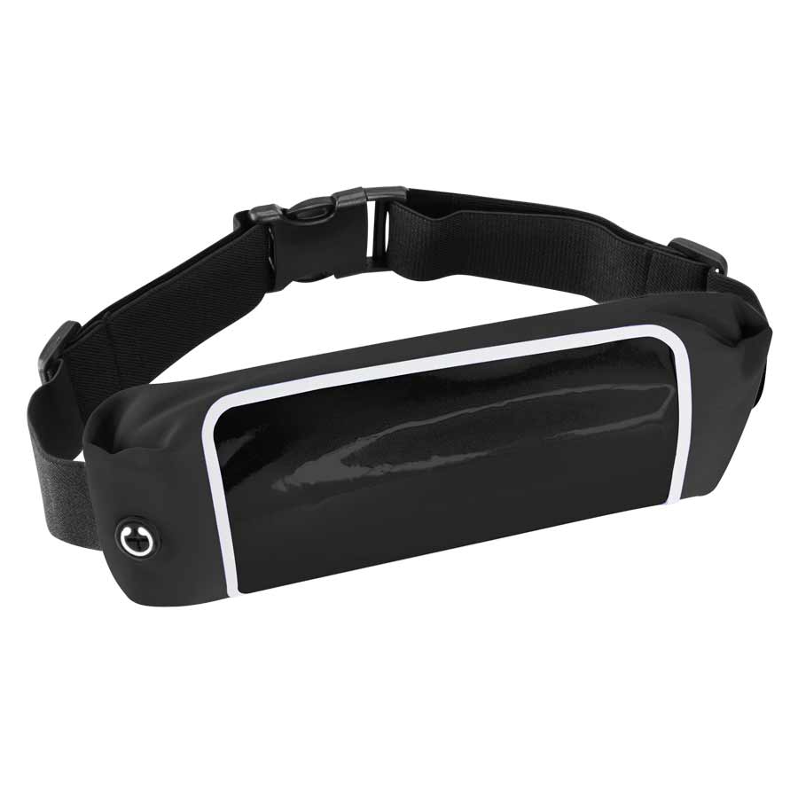 Deluxe Banano impermeable modelo “Jog”, en tela Polyester Stretch 210 Waterproof. Incluye banda-cinturón elasticado ajustable color negro, cierre-eclair posterior impermeable, salida para auriculares y ventana de PVC clear para smart-phone, compatible Samsung, i-Phone, Xperia y en general todas las marcas, modelos y tamaños. Bandas reflectantes color plateado en ambos lados. Ideal para practicar deportes.
