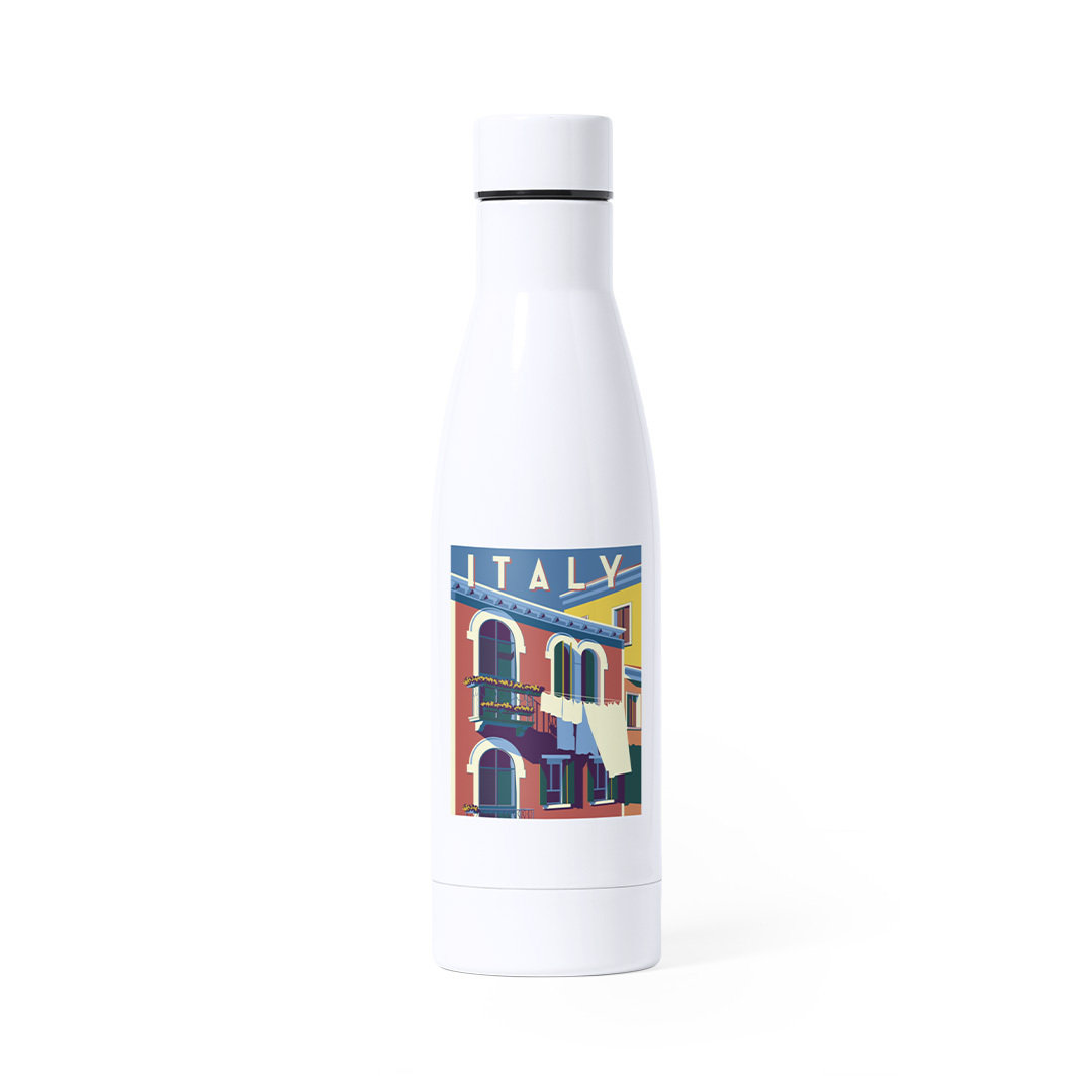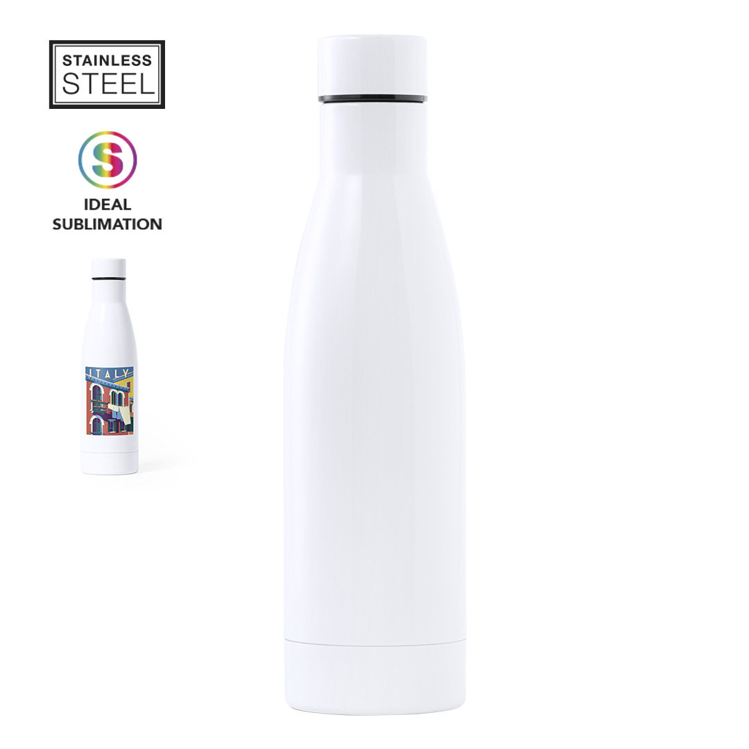 Bidón de acero inox de 750ml de capacidad. Acabado en suave y brillante color blanco, especialmente diseñado para marcaje en sublimación. Con tapón de seguridad en acero inox, libre de BPA. Presentado en atractiva caja de diseño. 750 ml