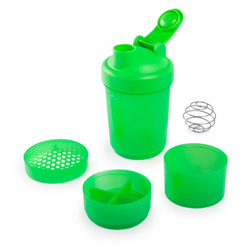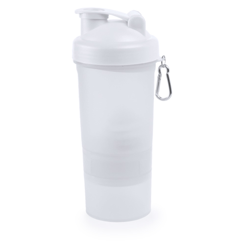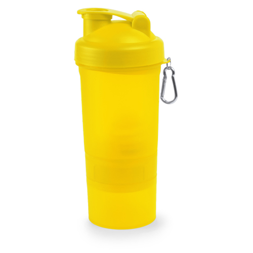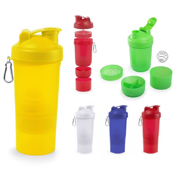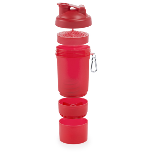 Bidón multi compartimento de 400ml de capacidad con cuerpo acabado en PP de vivos colores e ingenioso diseño. Con tapón a rosca y tapa con dosificador de seguridad. Mosquetón metálico de transporte. 400 ml
