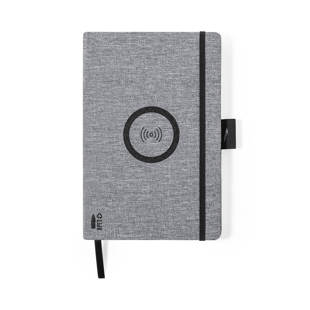Bloc de notas cargador de línea nature en resistente poliéster 300D RPET de tamaño A5 y elaborado a partir de plástico reciclado, para así fomentar la reutilización de residuos plásticos y ayudar a la sostenibilidad del planeta. Con cargador inalámbrico de 10W integrado en la portada. Incluye 80 hojas con disposición a una raya. Compatible con smartphones con tecnología de carga inalámbrica. Incluido cable de carga Tipo C y disponible manual de instrucciones en español e inglés. Inalámbrico 10W. Portada Rígida. 80 Hojas