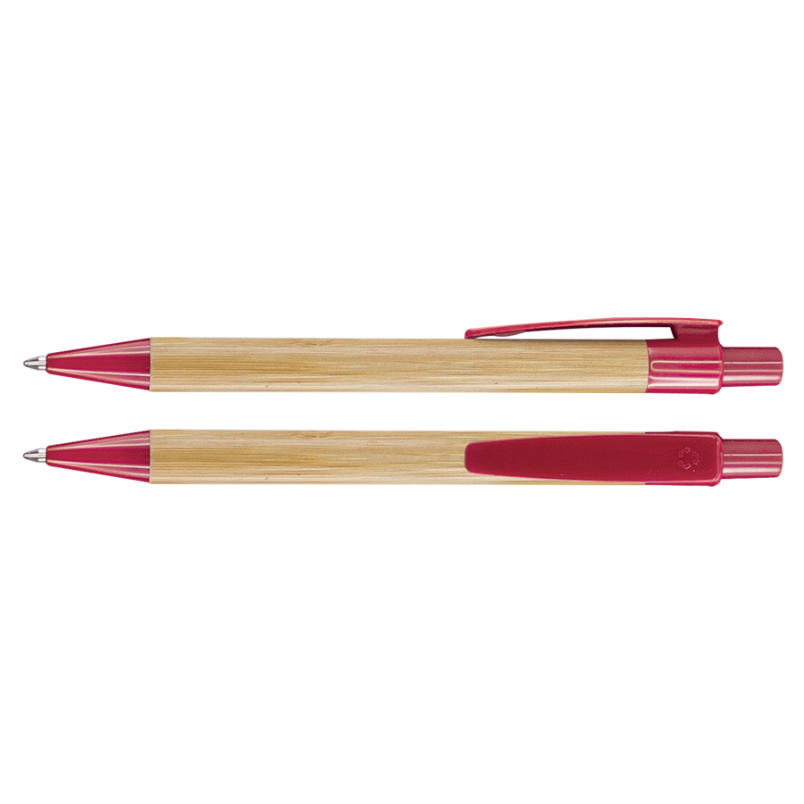 Bolígrafo modelo “Sustenta”. Cuerpo de madera de Bamboo, terminales de plástico PET reciclado. Escritura azul.
