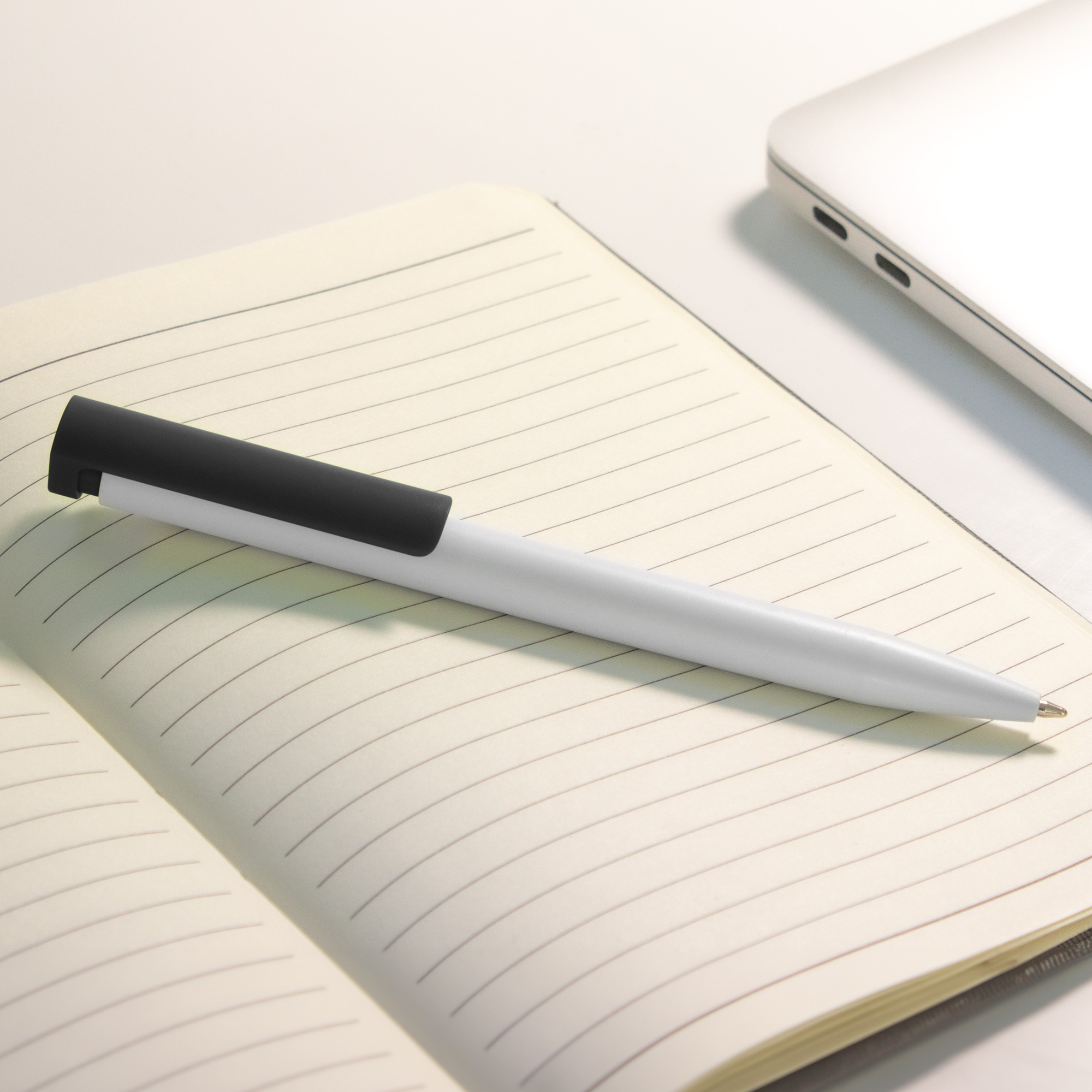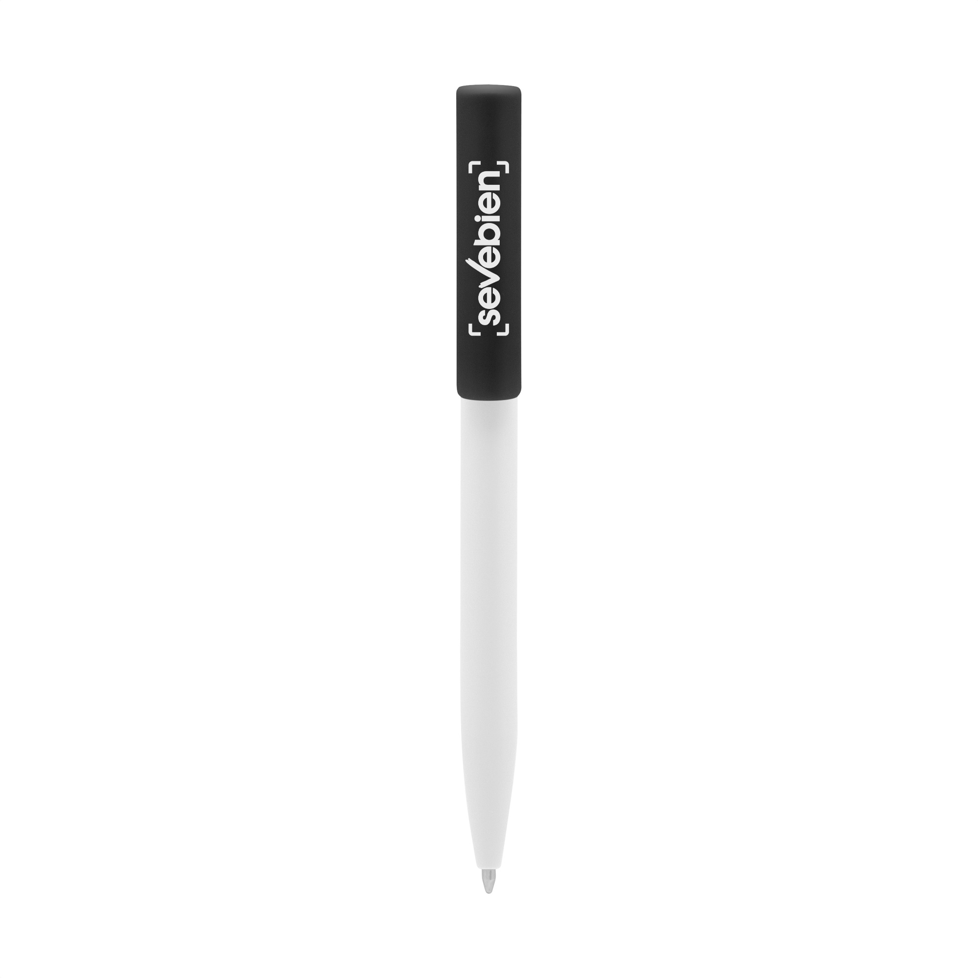 Plástico. Cuerpo blanco y clip de diferentes colores. Bolígrafo retráctil. Clip plástico de colores. Tinta negra. Sistema de botón push para destapar. Amplia área de impresión.