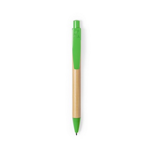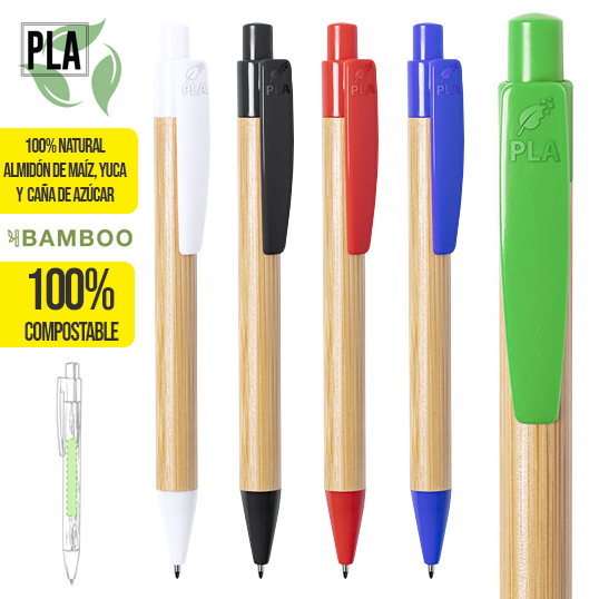 Bolígrafo de línea nature con mecanismo pulsador. Combinación de cuerpo en bambú brillo y accesorios en PLA -Ácido PoliLáctico-, que se obtiene a partir de recursos 100% naturales como el almidón de maíz, la yuca o la caña de azúcar, pudiendo convertirse en 100% compostable al final de su ciclo de vida útil. Clip con amplia superficie de marcaje y disponible en variada gama de colores, con tinta azul. Distintivo PLA en parte superior del clip.