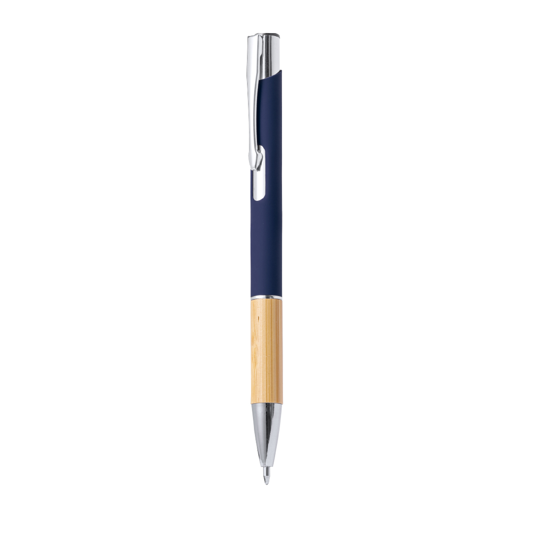 Elegante bolígrafo de línea nature y mecanismo pulsador. Cuerpo en resistente aluminio de acabado goma y empuñadura en bambú, con la caña en una amplia gama de distintivos colores. Clip metálico, con mecanismo pulsador y en tinta azul. Presentado en bolsa individual reciclada.
