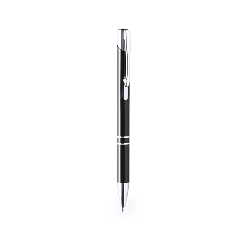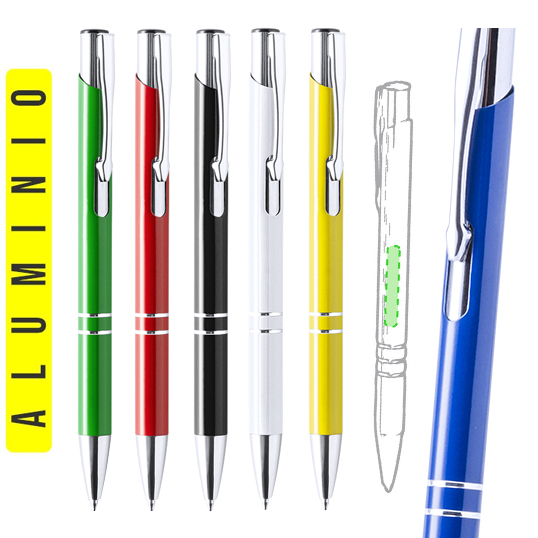 Bolígrafo con cuerpo en aluminio de acabado sólido brillante. Detalles en cromado y original muesca en cuerpo. De mecanismo pulsador, con cartucho jumbo y tinta azul. Carga Jumbo