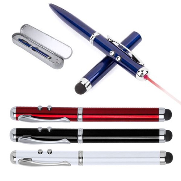 Bolígrafo láser con capucha, de mecanismo giratorio y elegante acabado metálico brillante. Incorpora pulsadores de activación laterales, práctico clip de fijación, capucha con puntero táctil y cuerpo curvado, especialmente diseñado para marcaje en láser. Pilas de botón incluidas, y presentado en un elegante estuche metálico con suave esponja troquelada y pilas de recambio. 1 Led. Pilas Botón Incluidas