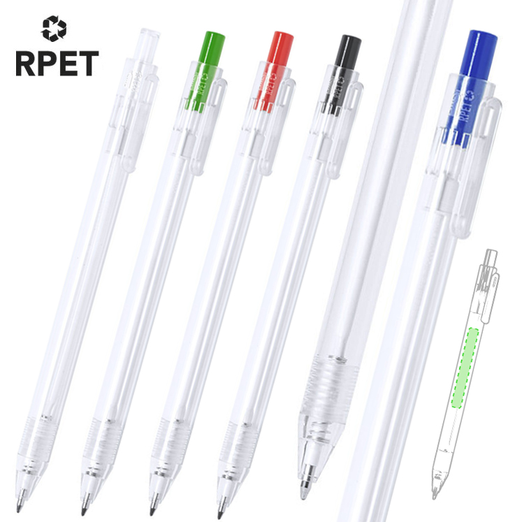 Bolígrafo de línea nature en material RPET, elaborado a partir de plástico reciclado para así fomentar la reutilización de residuos plásticos y ayudar a la sostenibilidad del planeta. De acabado translúcido y con pulsador disponible en variada gama de colores, con distintivo RPET en el cuerpo del bolígrafo. Especialmente diseñado para marcaje en tampografía, de mecanismo pulsador y con tinta azul.