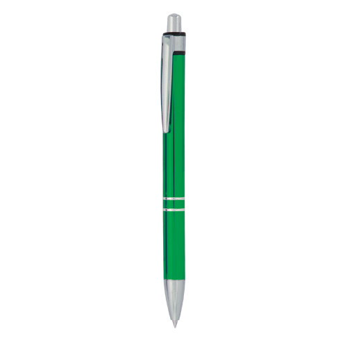 Bolígrafo de mecanismo pulsador en original diseño bicolor. Con cuerpo en aluminio de suave acabado en alegres colores. Accesorios y anillas en plateado. Clip de original diseño y tinta azul.