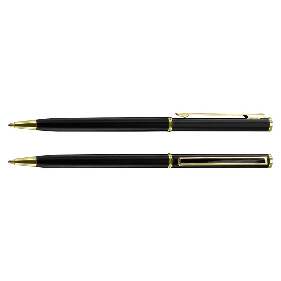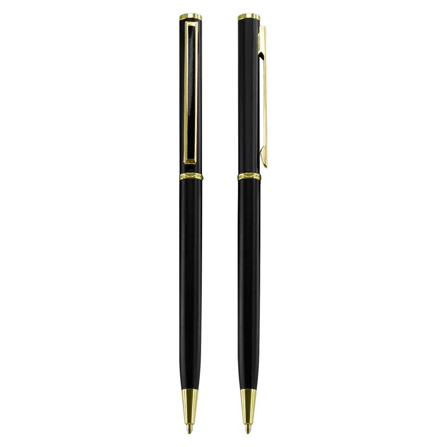 Bolígrafo Metálico negro “Tourist”, con terminales dorados. Especial para el rubro Hotelería y Turismo. Escritura negra.