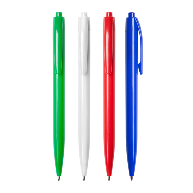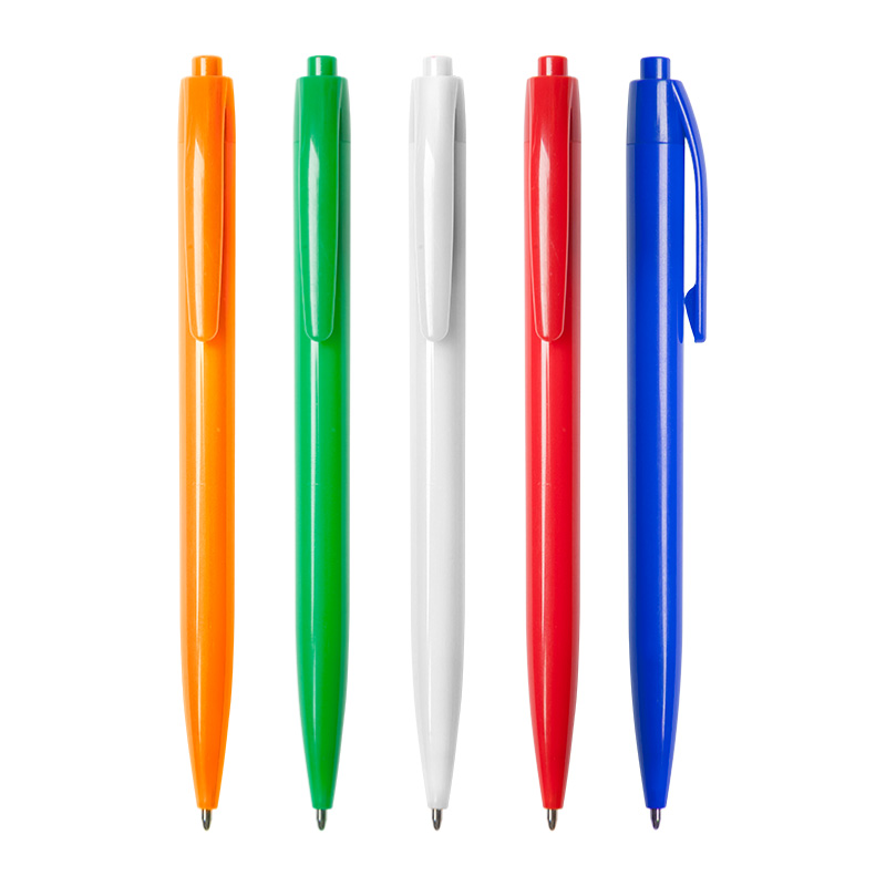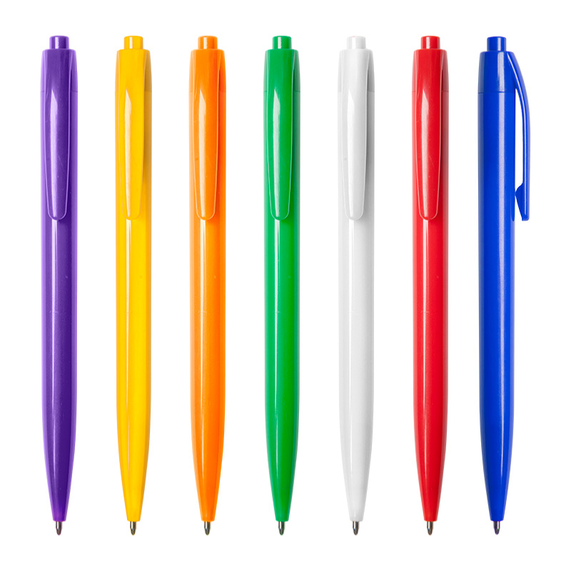 Plástico. Bolígrafo con cuerpo plástico de color con pulsador. Tinta negra.