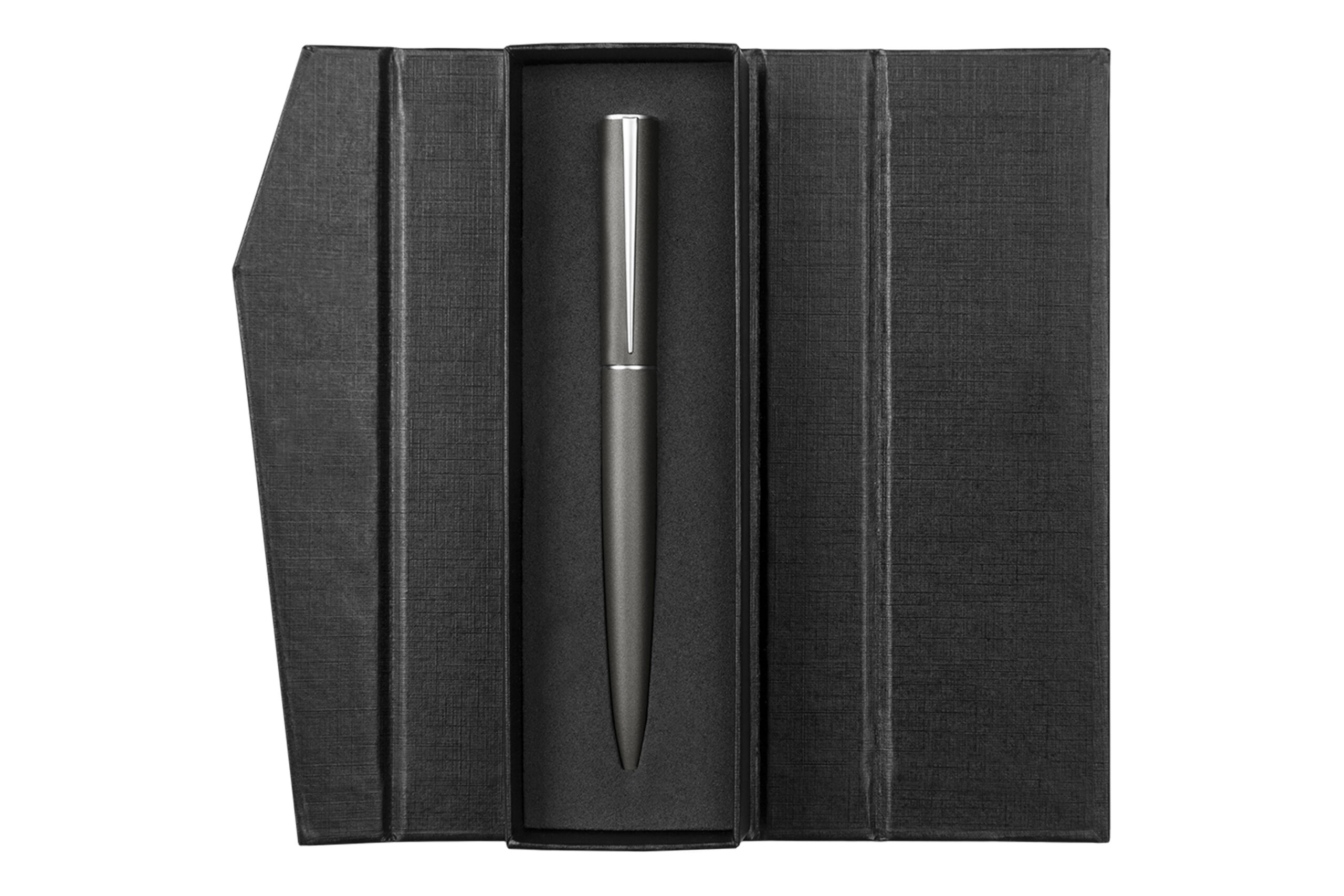 Metálico. Cuerpo color mate. Clip y anillo de acero. Apertura giratoria. Parte superior destapa acero. Parte inferior destapa dorado. Estuche de cartón. Tinta negra. Presentación en estuche con cierre magnético.