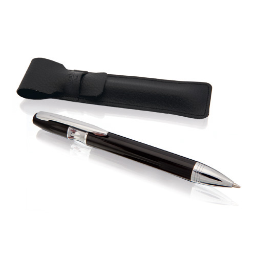 Bolígrafo de Alexluca de mecanismo giratorio en elegante diseño bicolor y suave cuerpo metálico en llamativos colores. Con original anilla, clip y punta en acabado plateado brillante y logotipo de la marca en parte superior. Presentado en funda individual de popiel en color negro con logotipo de la marca. De cartucho jumbo con tinta azul. Carga Jumbo. Funda Polipiel
