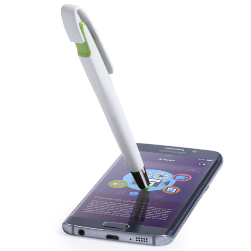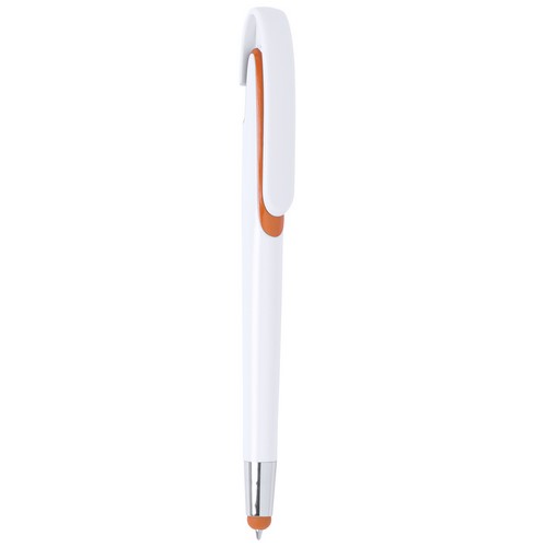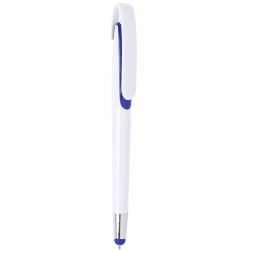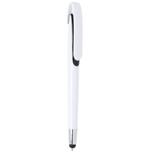 Bolígrafo puntero de mecanismo pulsador con cuerpo de acabado brillante en color blanco y accesorios en variada gama de vivos colores. Con clip maxi y tinta azul.