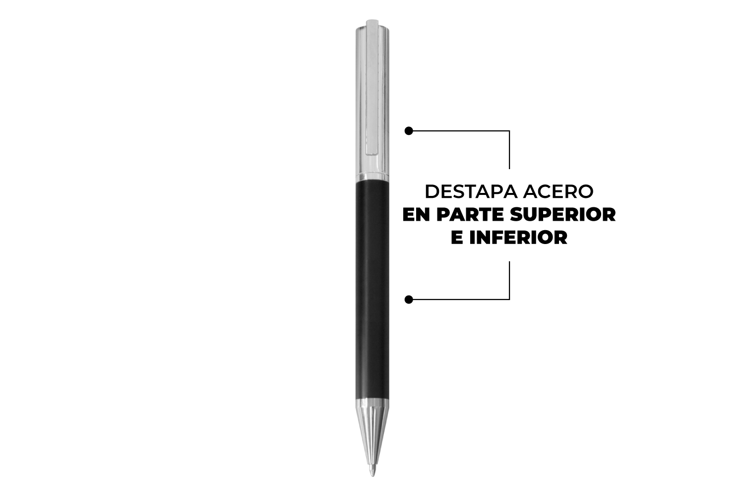 Metálico. Bolígrafo con apertura giratoria. Destape acero en la parte superior e inferior. Cuerpo color negro. Clip, tambor superior y puntera color plata. Tinta azul. Presentación en estuche con cierre magnético.
