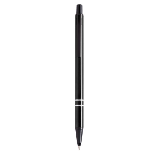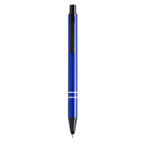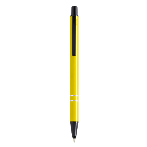 Bolígrafo de mecanismo pulsador en original diseño bicolor. Con cuerpo en aluminio de suave acabado en alegres colores. Accesorios en color negro y anillas en plateado. Tinta azul.