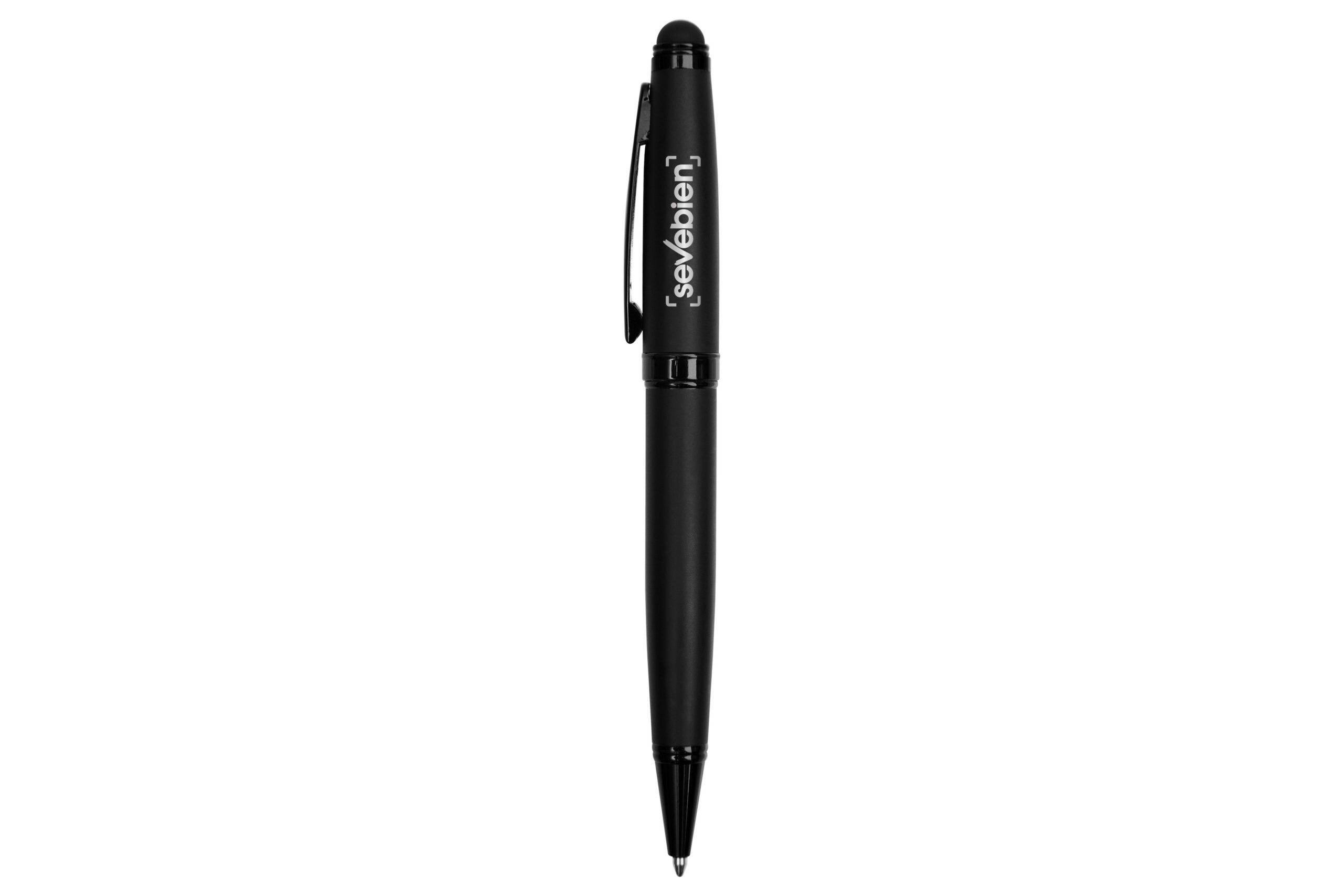 Metal. Cuerpo metálico negro mate. Clip y puntera de metal. En la parte de arriba touch. Apertura giratoria. Tinta negra. Con estuche. Destape electroplateado en la parte superior. Presentación en caja de regalo.