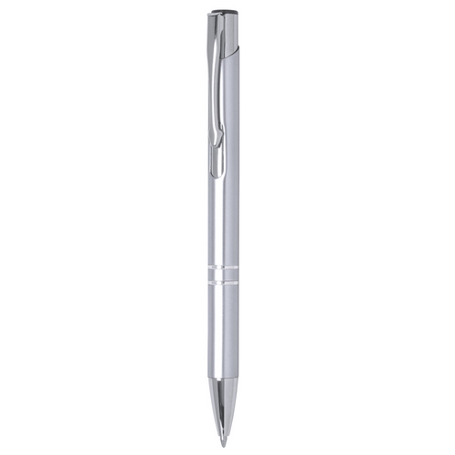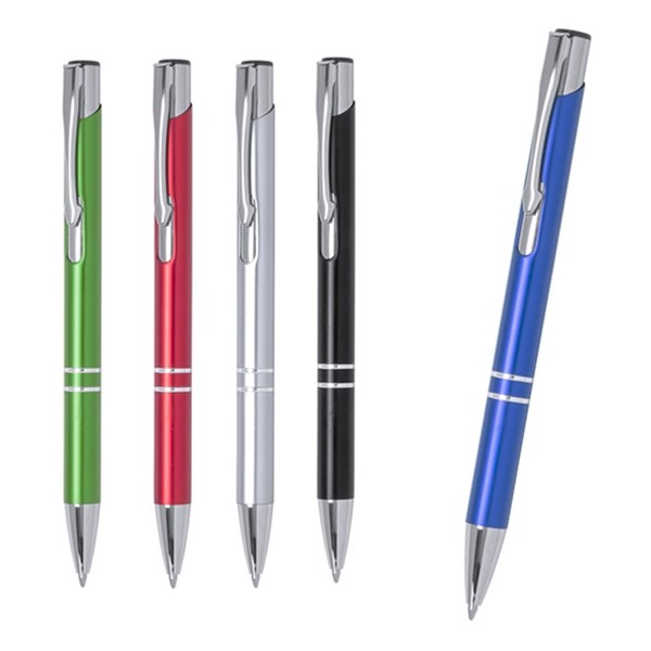 Original bolígrafo de mecanismo pulsador en elegante diseño bicolor. Con cuerpo troquelado en aluminio de suave acabado en variados colores. Original clip, anillas y punta en plateado. De cartucho jumbo y tinta azul. Carga Jumbo