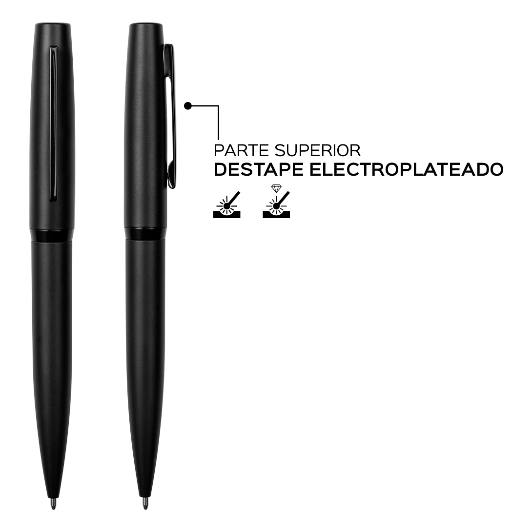 Metálico. Cuerpo color mate. Clip y anillo metálico. En la parte superior destape electroplateado. Apertura giratoria. Tinta negra. Presentación en caja de regalo.