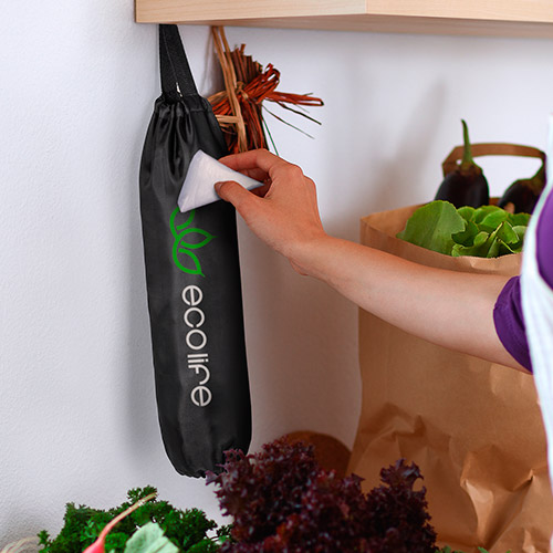 Bolsa de reciclaje para guardar bolsas de plástico. En suave poliéster 210D de alegres colores y con apertura superior e inferior. Con cinta a juego para colgar.