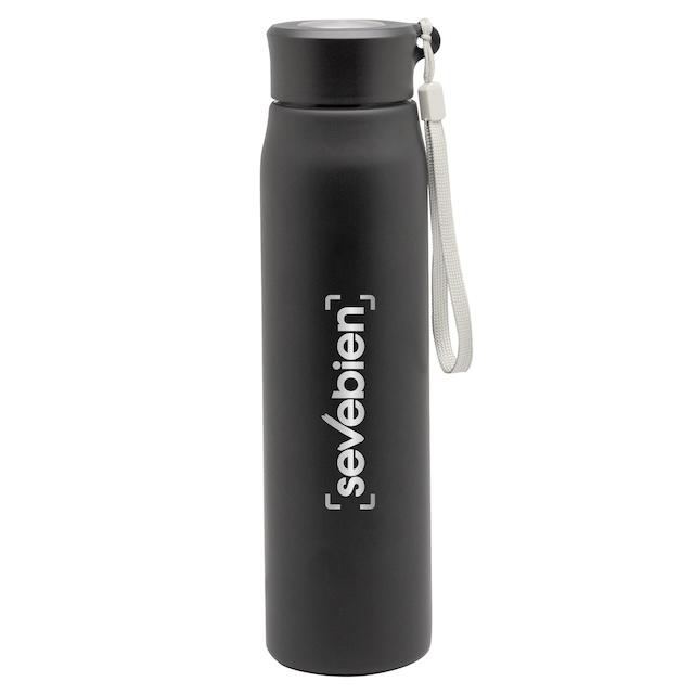Ø 6,5 x 25 cm. Capacidad 800ml. Acero inoxidable. Botella de acero inoxidable 304. Tapa combinada en plástico y acero inoxidable 201 con tira de color gris de 12 cm de largo. Ideal para llevarla a todos lados. Presentación en caja de regalo.