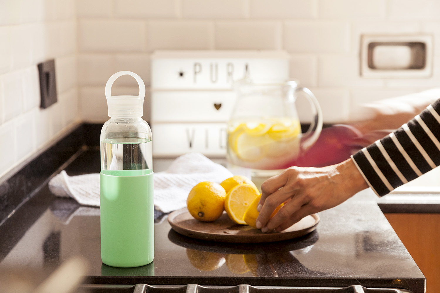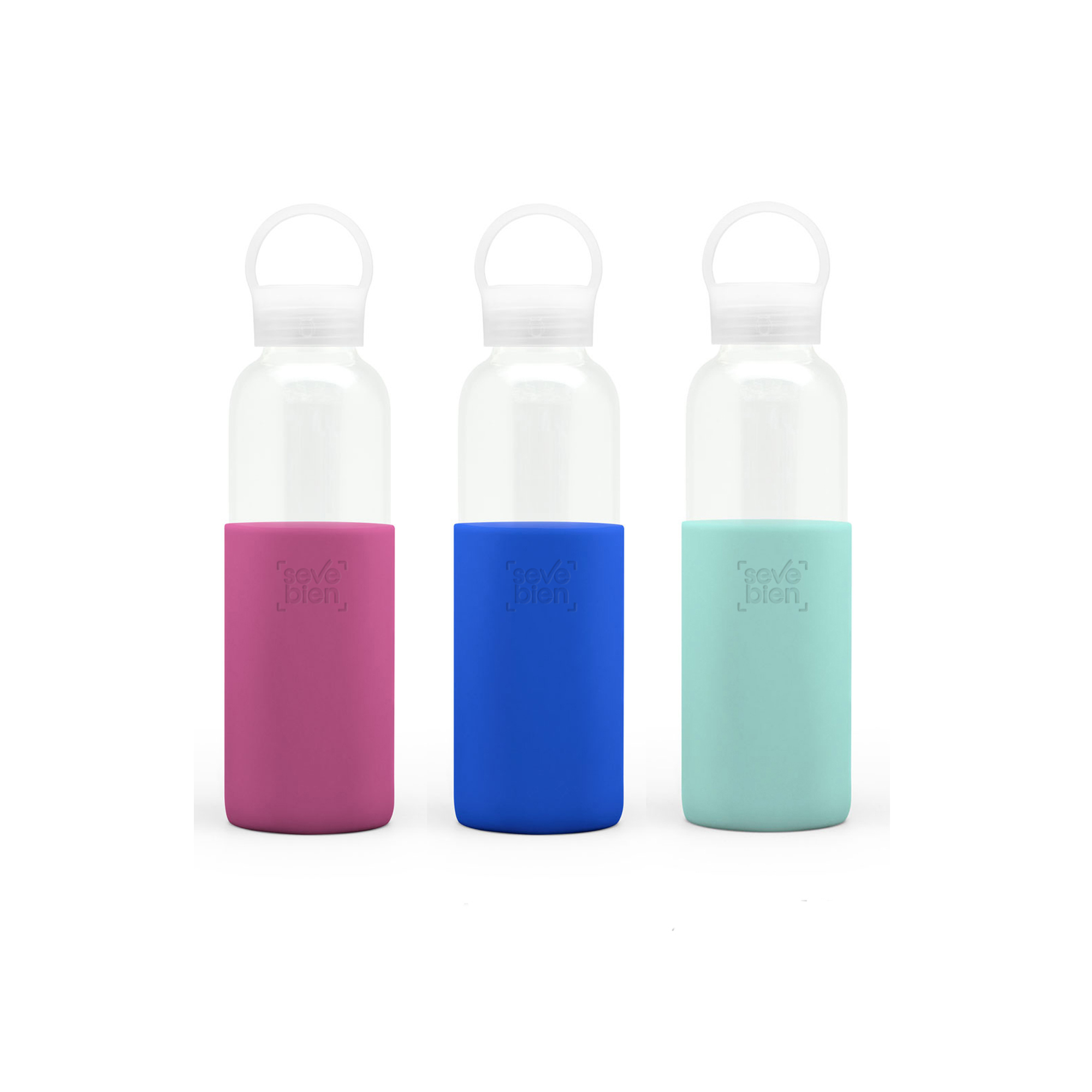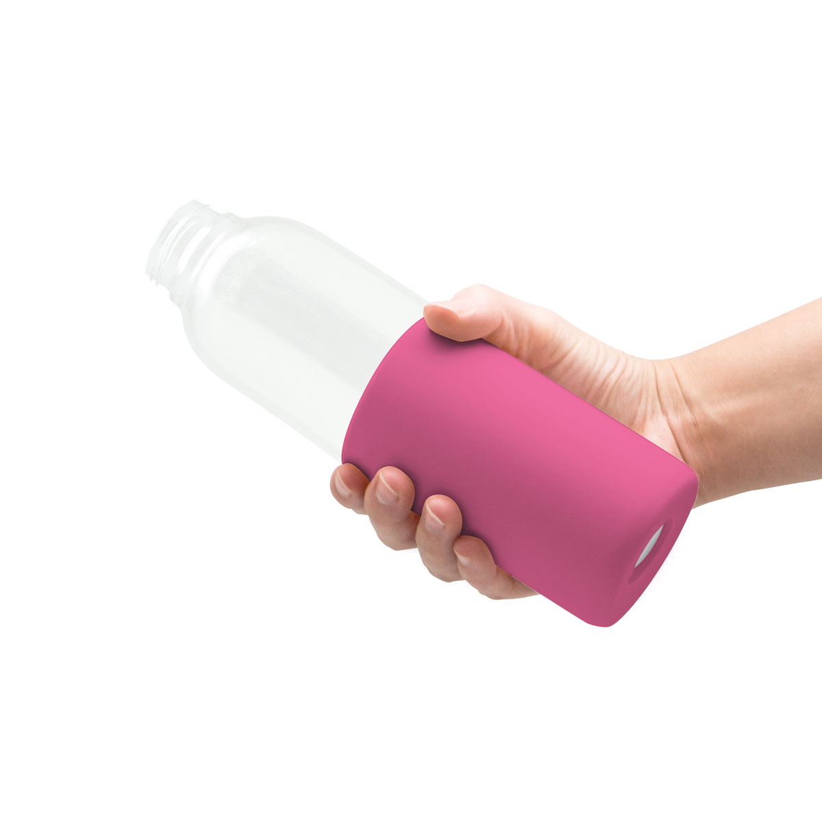 Ø 6,5 x 24 cm. Capacidad 500 ml. Vidrio de borosilicato. Botella práctica y reutilizable. Posee manga de silicona antideslizante en varios colores y pico ancho. Tapa a rosca, antiderrame y con manija de agarre. Presentación en caja de regalo.