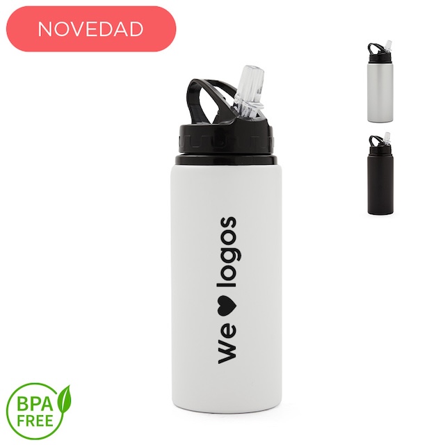 Botella de aluminio con capacidad de 600 ml. Tapa a rosca con boquilla y con agarre, para facilitar su transporte. El producto viene en una bolsa de PLA 100% compostable. Ideal para deporte o uso diario. Dimensiones: 21 x 7 cm.