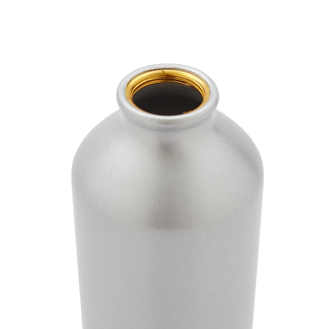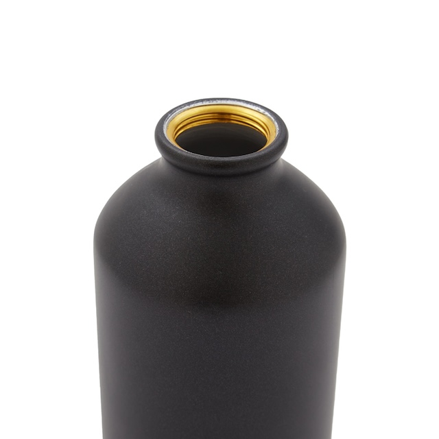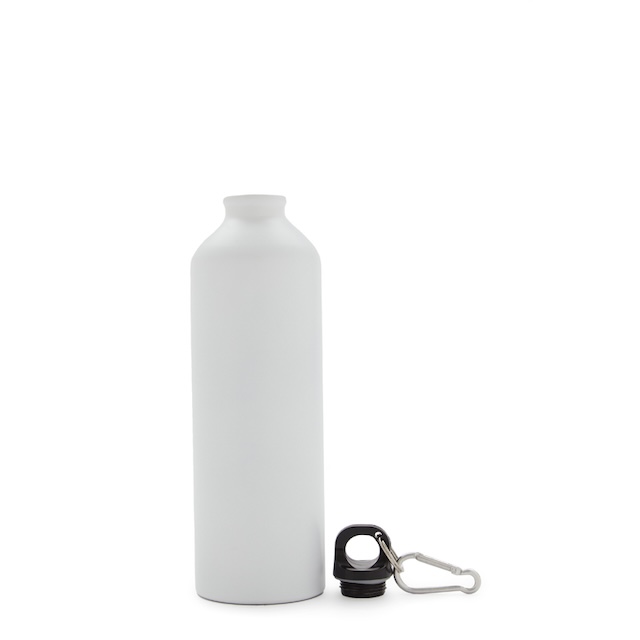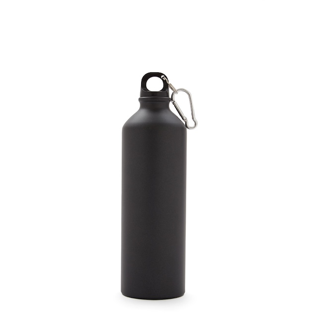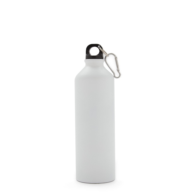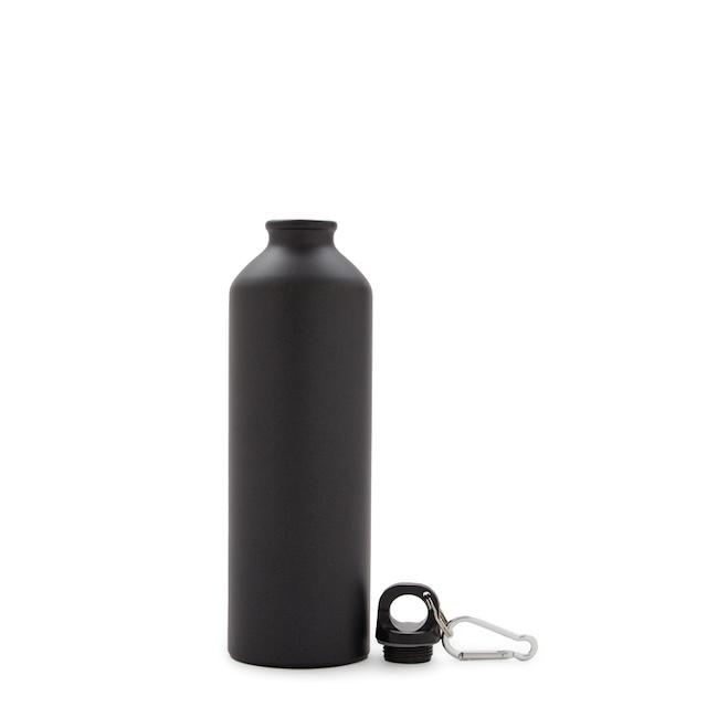 Botella de aluminio con tapa anti-derrame a rosca, Incluye gancho carabinero. Producto libre de BPA. Capacidad: 750 ml. Las botellas en color Negro y Blanco son Mate, La botella gris tiene aspecto metálico. El producto se presenta en una bolsa de PLA 100% compostable.