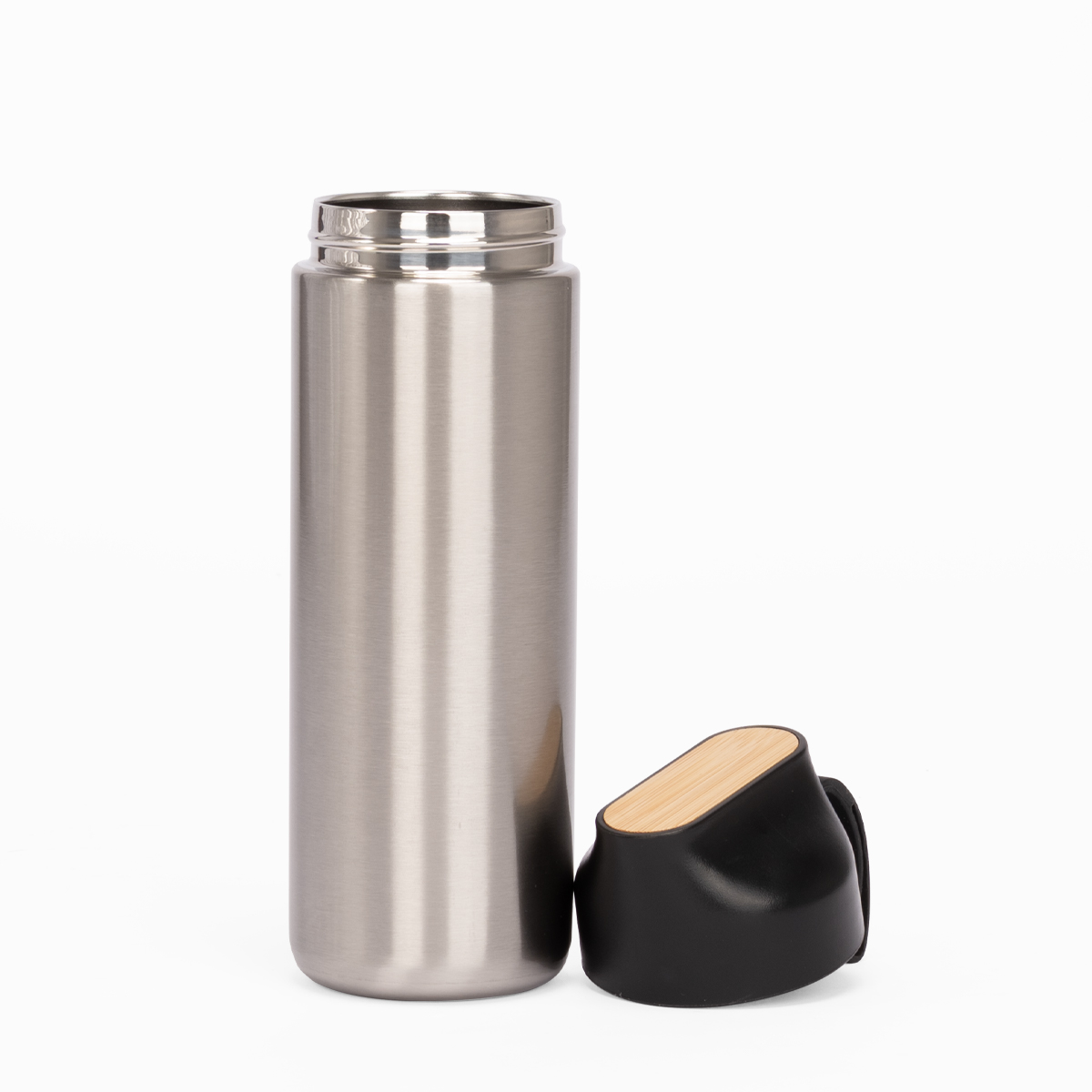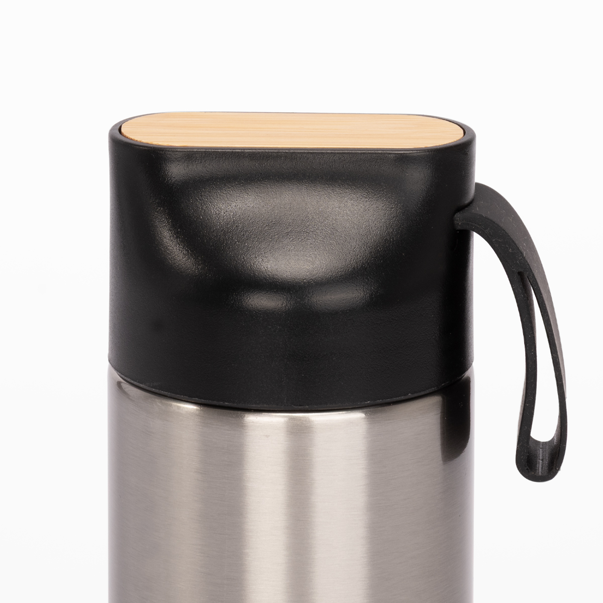OJAI es una botella térmica de 600 ml que une resistencia, elegancia y compromiso ambiental. Fabricada en acero inoxidable reciclado con aislamiento de doble pared, mantiene tus bebidas frías o calientes por más tiempo, acompañándote en cada paso del día. Su tapa de plástico negro con detalle de bambú y asa de silicona añade un toque natural y funcional al diseño. OJAI es ideal para marcas que desean inspirar hábitos sostenibles con productos duraderos, prácticos y con propósito.