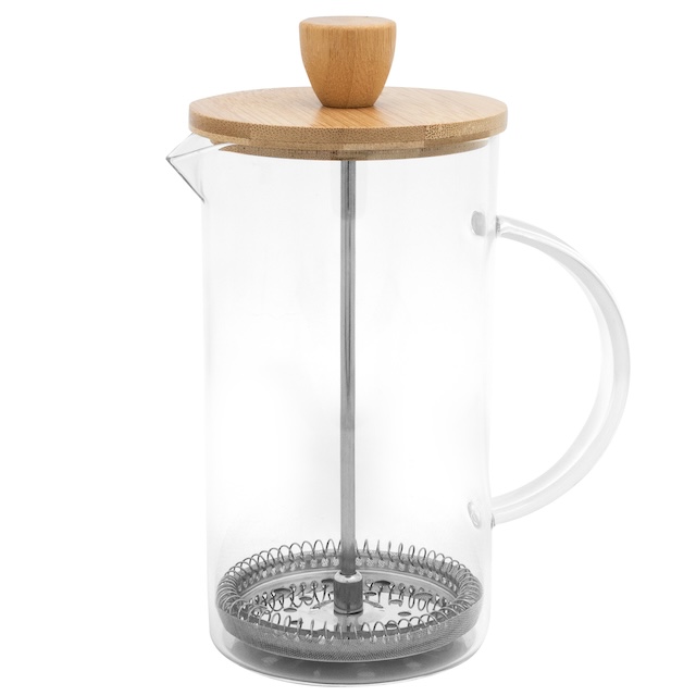 Ø 8 x 18 cm. Capacidad 600ml. Vidrio de Borosilicato + Tapa de bambú. Cafetera Prensa Francesa con filtro de aluminio. Presentación en caja de regalo Kraft.
