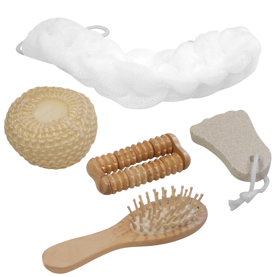 Canasto SPA de belleza en madera modelo “Naturals”. Contiene cepillo de pelo, esponja malla, masajeador de madera, piedra pomez y esponja de masaje corporal.