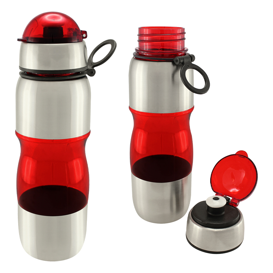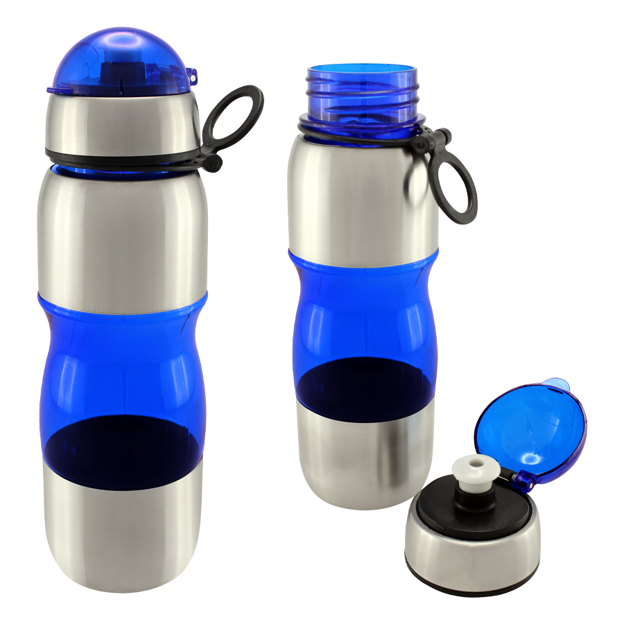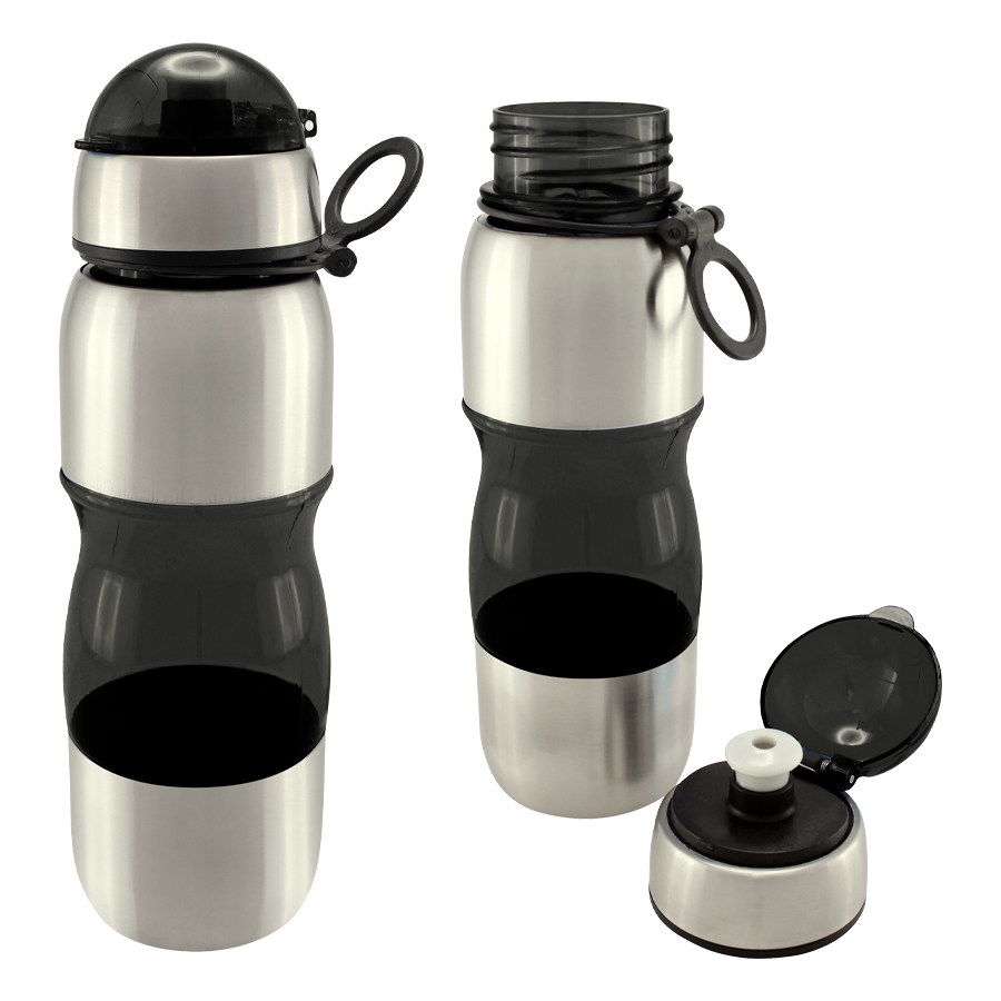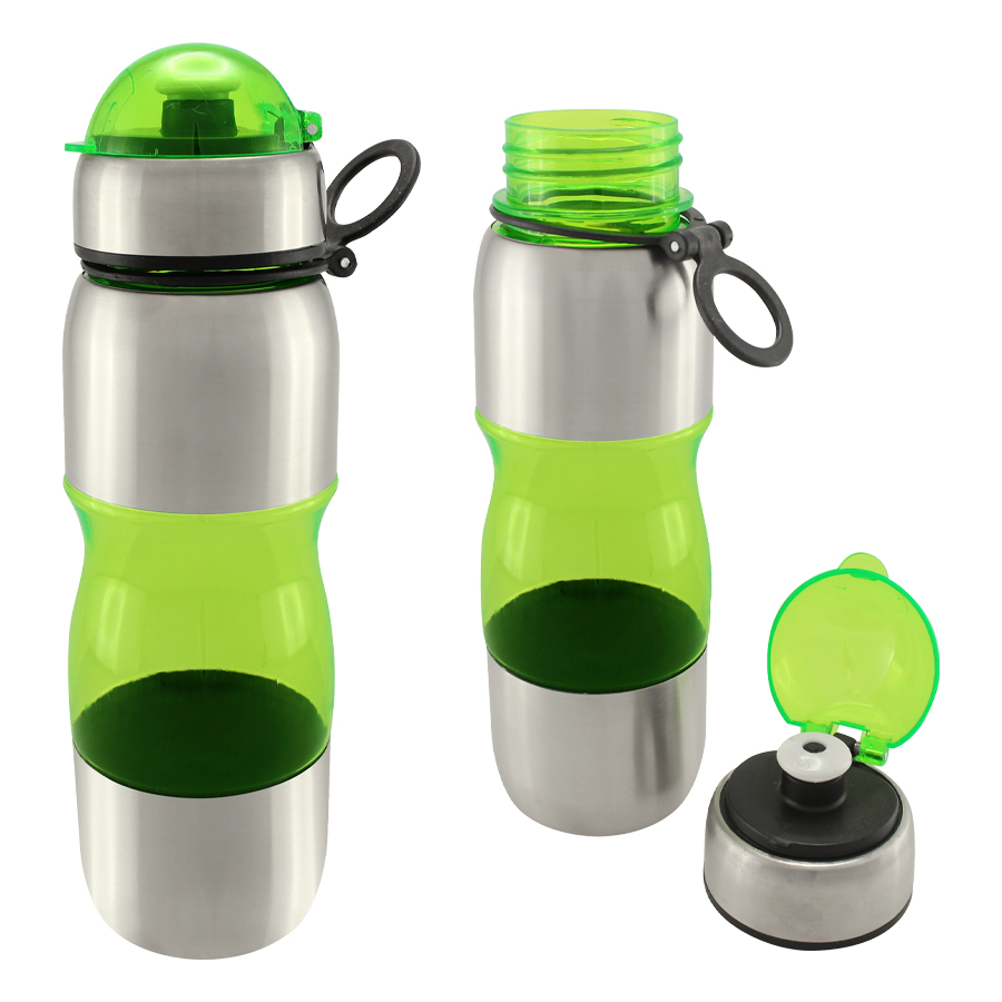 Botella deportiva modelo “Trend”, de Acero Inoxidable con plástico rígido traslúcido. Para líquidos fríos (no térmico).