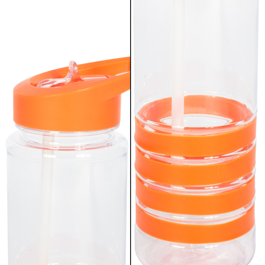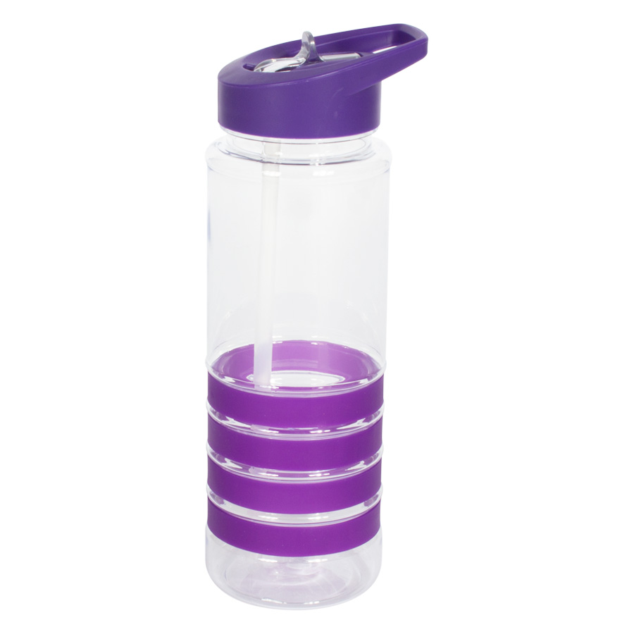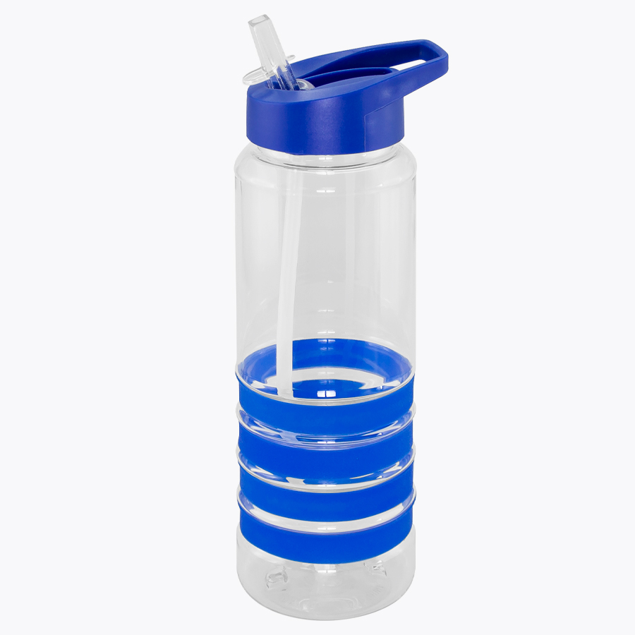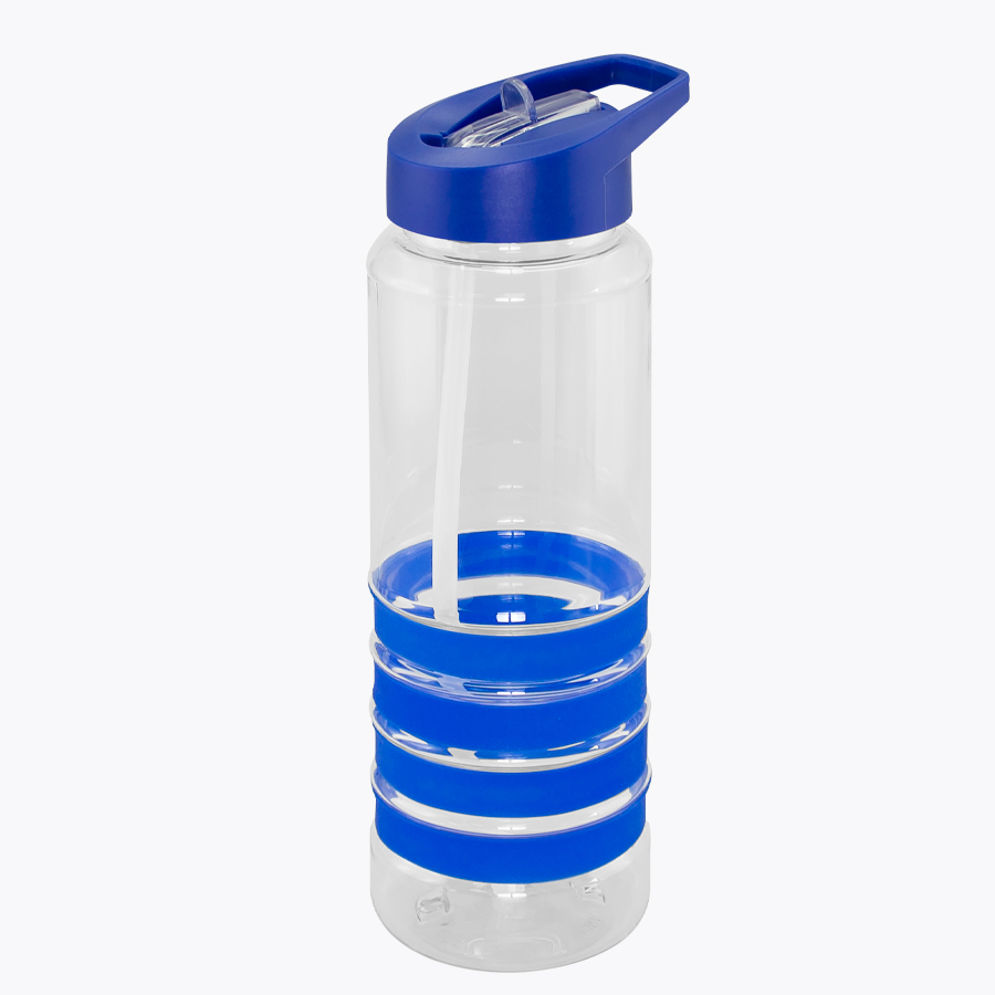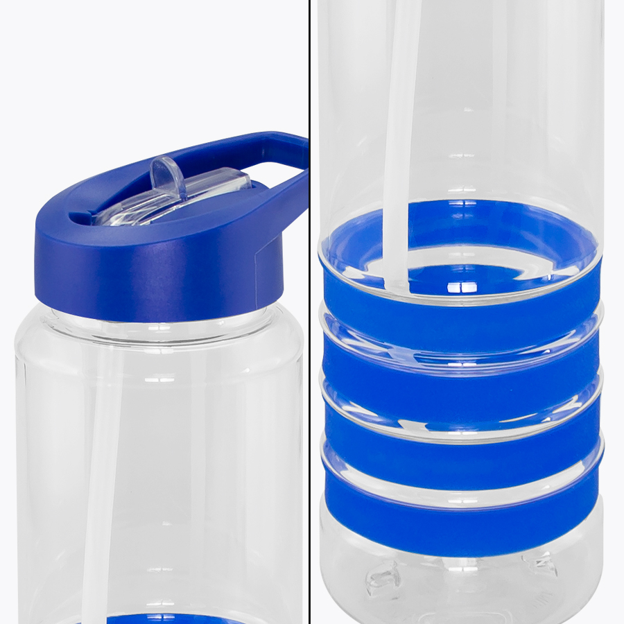 Botella deportiva modelo “Tritan”, de plástico rígido traslúcido Tritan con 4 anillos de silicona de color. Tapa de plástico PP de color con bebedero retráctil. Incuye bombilla plástica en el interior. Para líquidos fríos (no térmico).