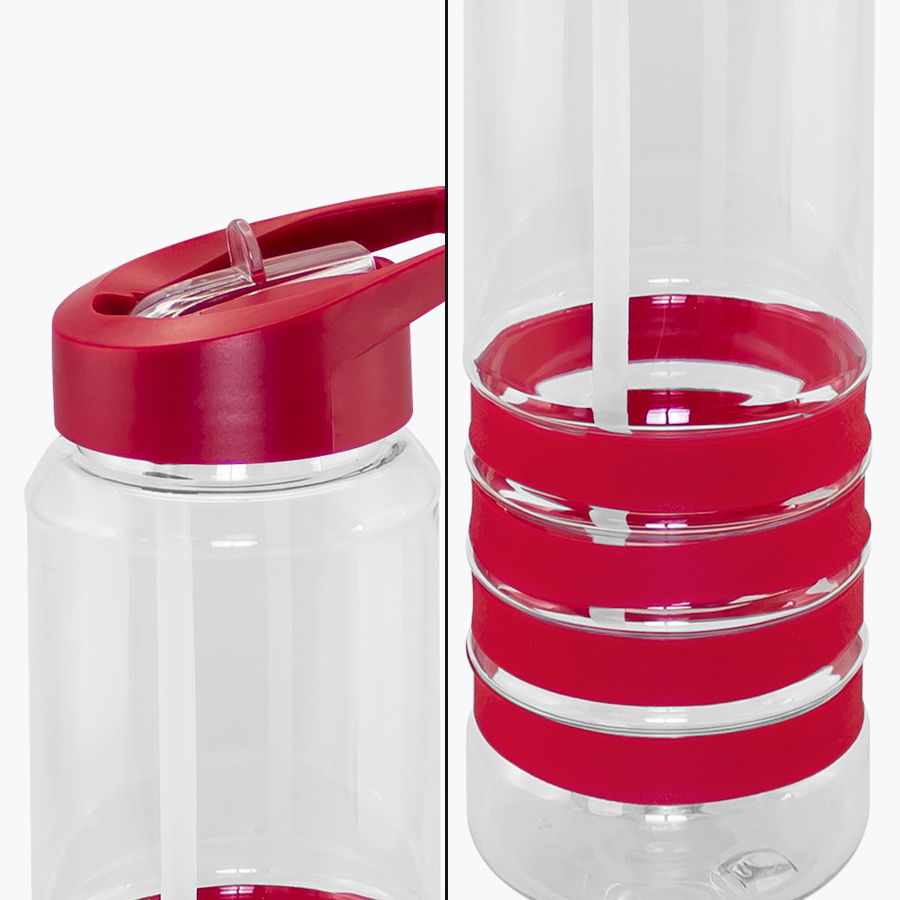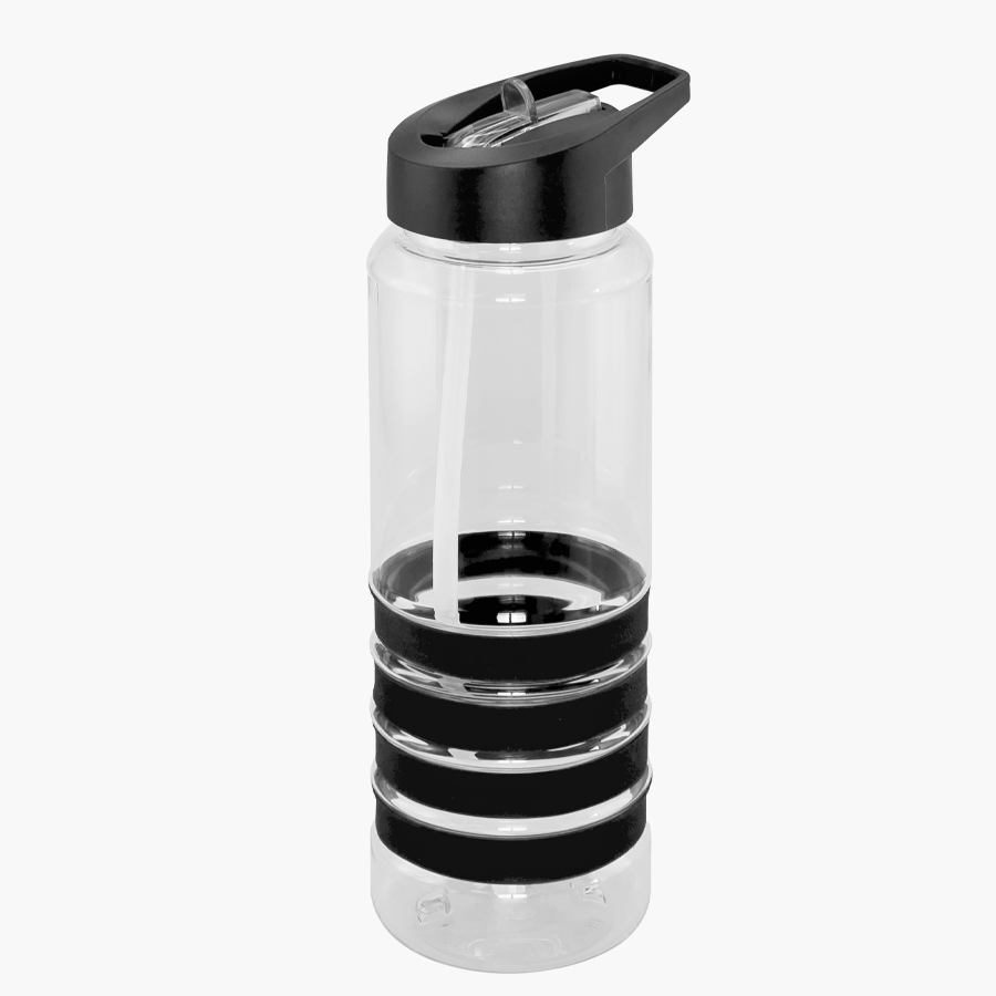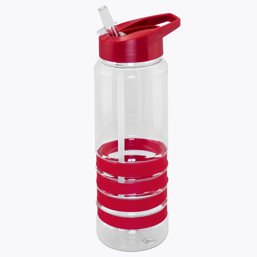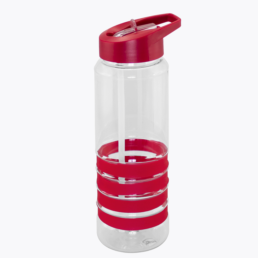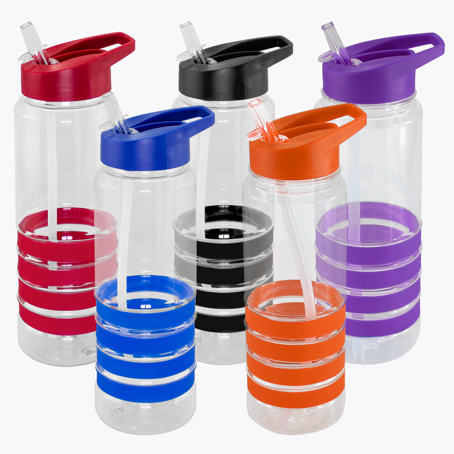 Botella deportiva modelo “Tritan”, de plástico rígido traslúcido Tritan con 4 anillos de silicona de color. Tapa de plástico PP de color con bebedero retráctil. Incuye bombilla plástica en el interior. Para líquidos fríos (no térmico).