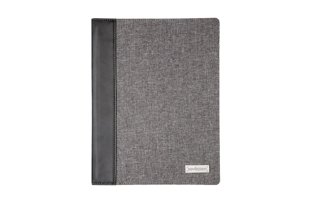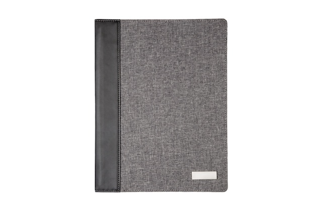 24 x 31 (cerrado). 48 x 31 (abierto). Lino 150D. Placa metálica para grabado (Medida: 5x2cm). Interior plástico. Con porta tarjetas y porta Bolígrafos elásticos. Bloc tamaño A-4 con 20 hojas blancas.