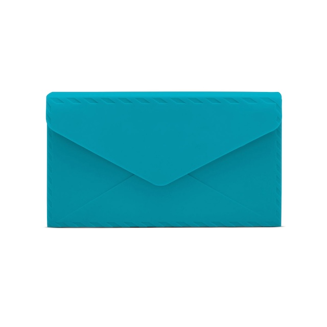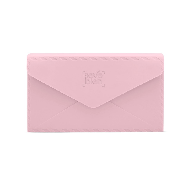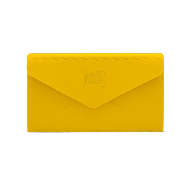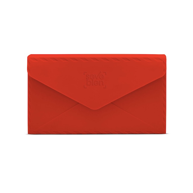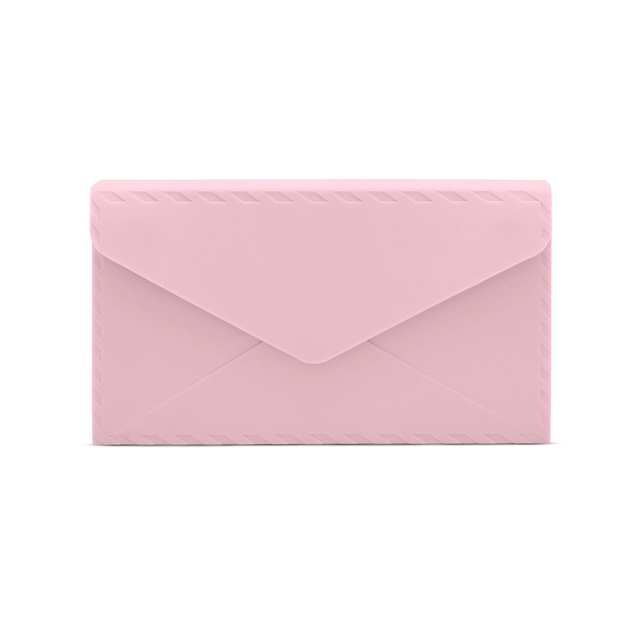 21,5 x 12,2 x 5 cm. Silicona. Cartera de mano en forma de sobre con solapa imantada y correa desmontable. Presentación en caja de regalo.