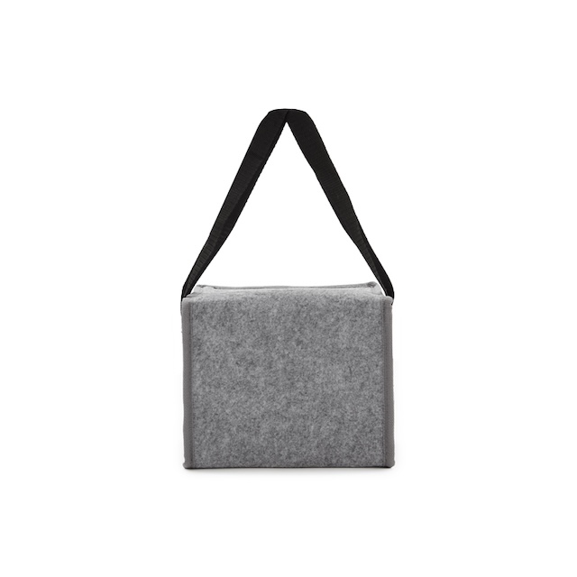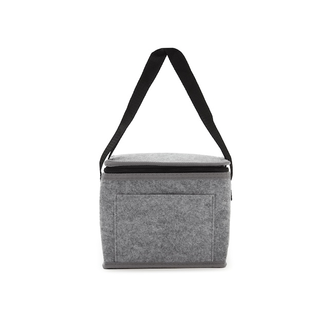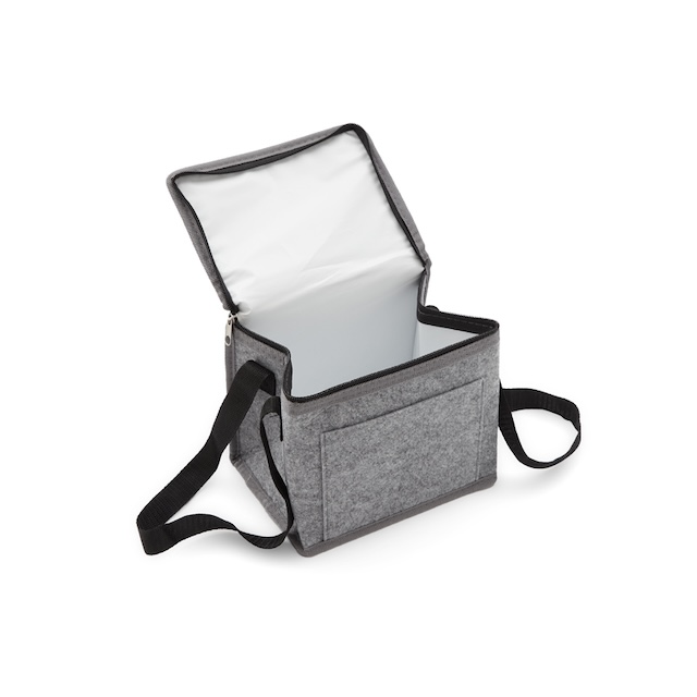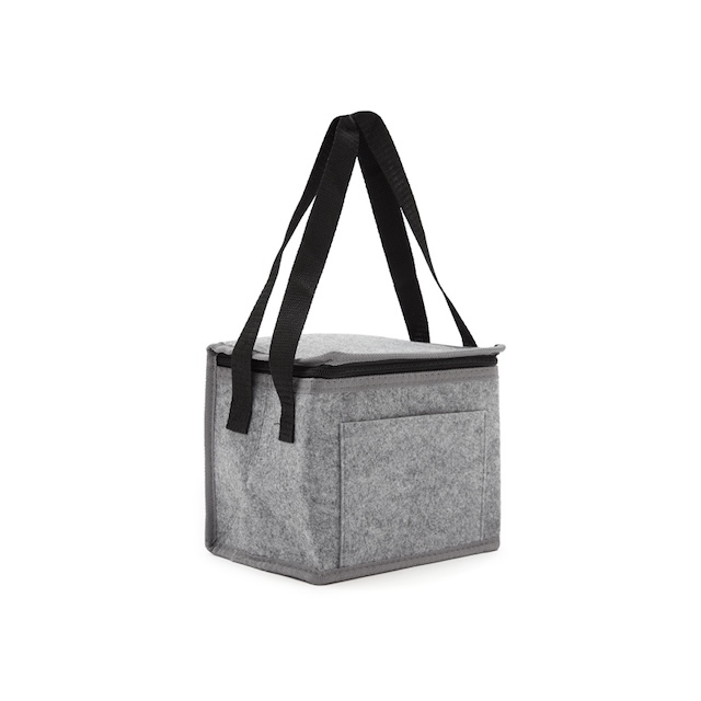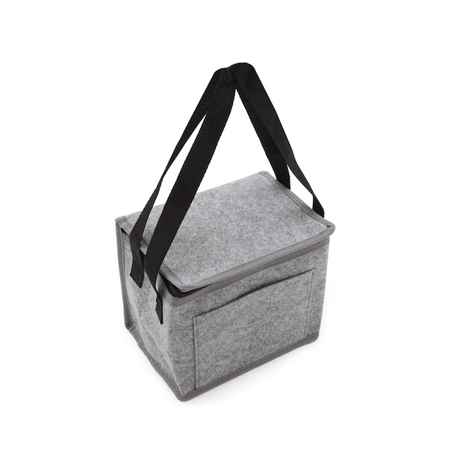 Cooler fabricado en fieltro de RPET, confeccionada a partir de botellas recicladas, con 2mm de espuma de polietileno laminado con película de aluminio. El producto se presenta en una bolsa de PLA 100% compostable. Ideal para transportar comida y bebida, conservando el frío. Dimensiones: 20,5 x 18 x 15 cm. Capacidad 5L. Reuseme.