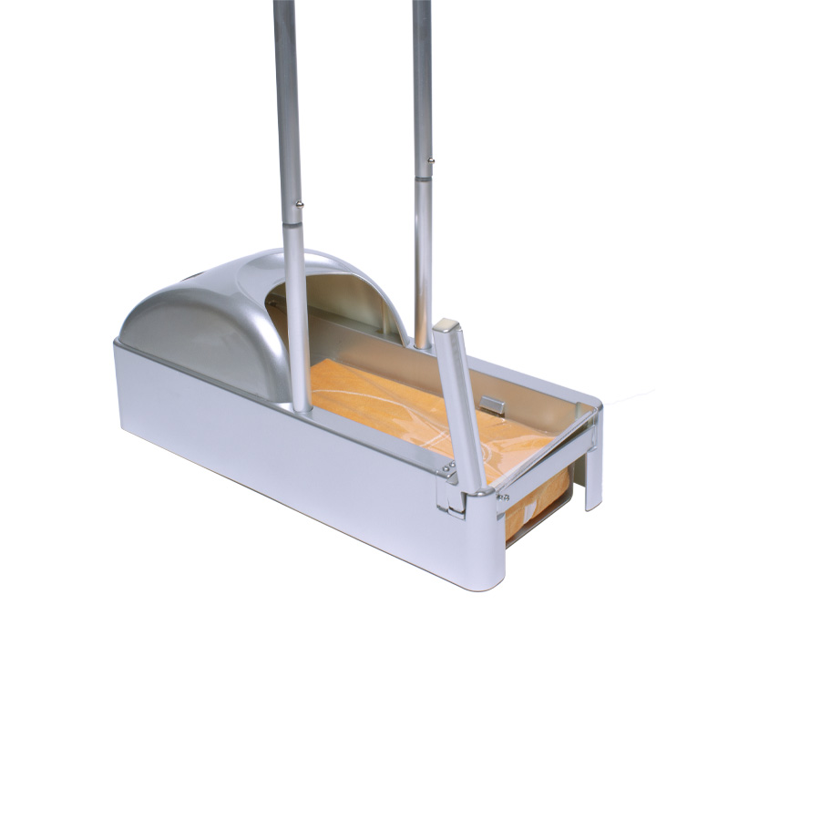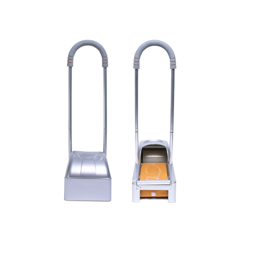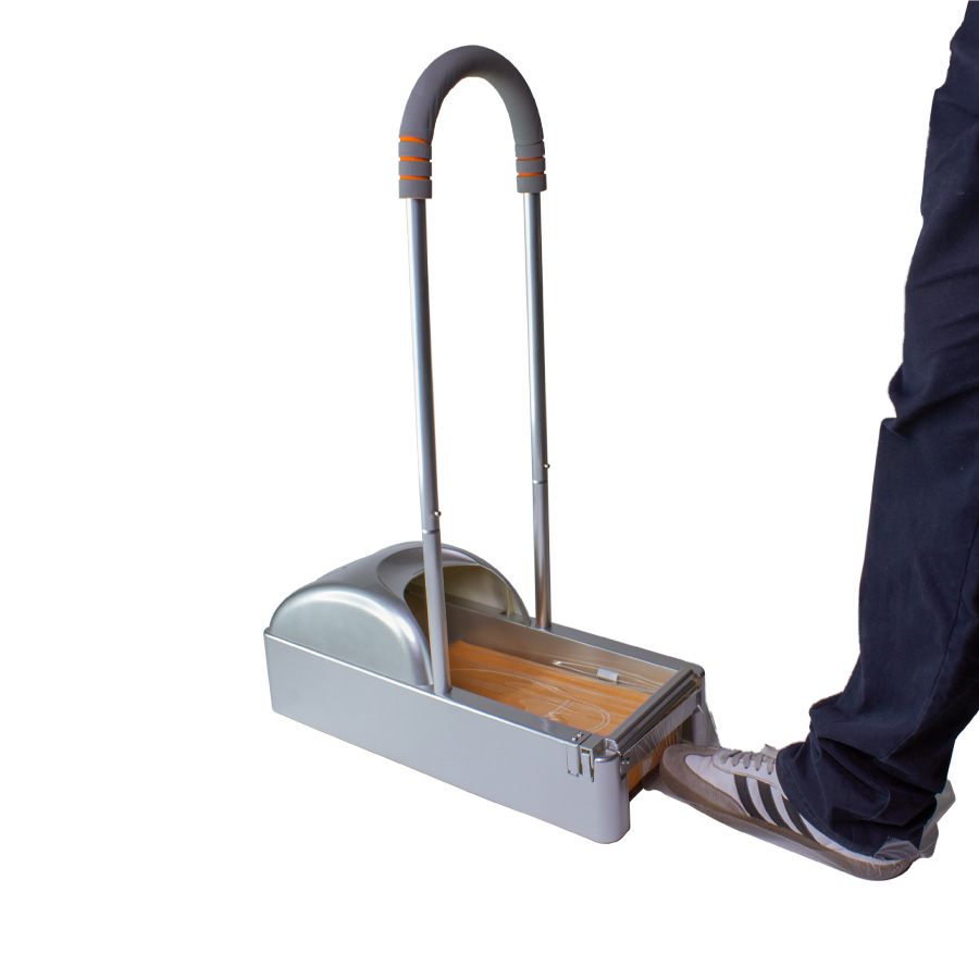 Dispensador de plástico ABS con estructura metálica, para Cubre-Calzado industrial. En cada pisada, entrega cobertor filom plástico PE adherente, ideal para mantener el calzado protegido de virus y bacterias en ambientes protegidos. Cuenta con soporte de apoyo manual de 65cm de altura. En el interior de debe instalar un rollo de film plástico PE protector (R18), que se adhiere a la planta del calzado en forma automática en cada pisada dentro del dispensador.