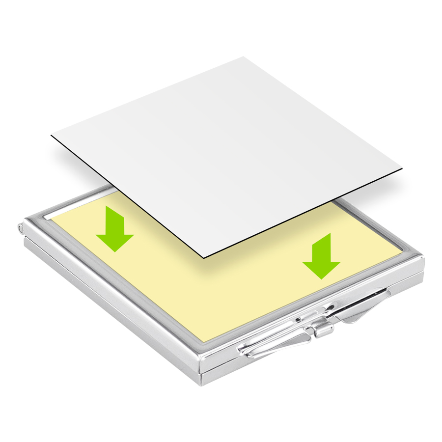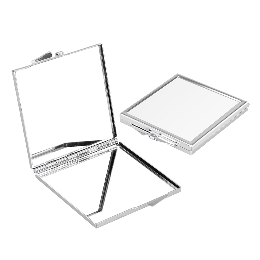 Espejo metálico cuadrado doble, con tapa, con cuadrado para Sublimación. Presentación en caja laminada blanca.