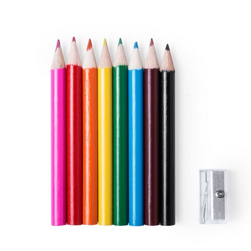 Estuche con cierre de cremallera a juego en poliéster 420D, de variados colores y con accesorio mosquetón giratorio. Incluye sacapuntas y 8 lápices de cuerpo redondo y de acabado brillante en variada gama de colores. 10 Piezas