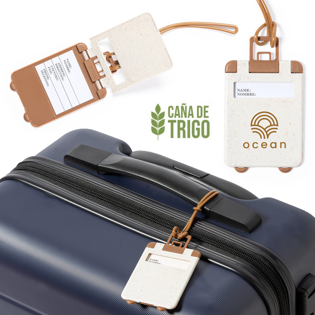 Identificador para maletas de línea nature y original diseño trolley, fabricado en caña de trigo. Con resistente cinta de acople y tarjeta de identificación en español e inglés. La caña de trigo fomenta la utilización de materias primas naturales, reduciendo así las emisiones contaminantes.