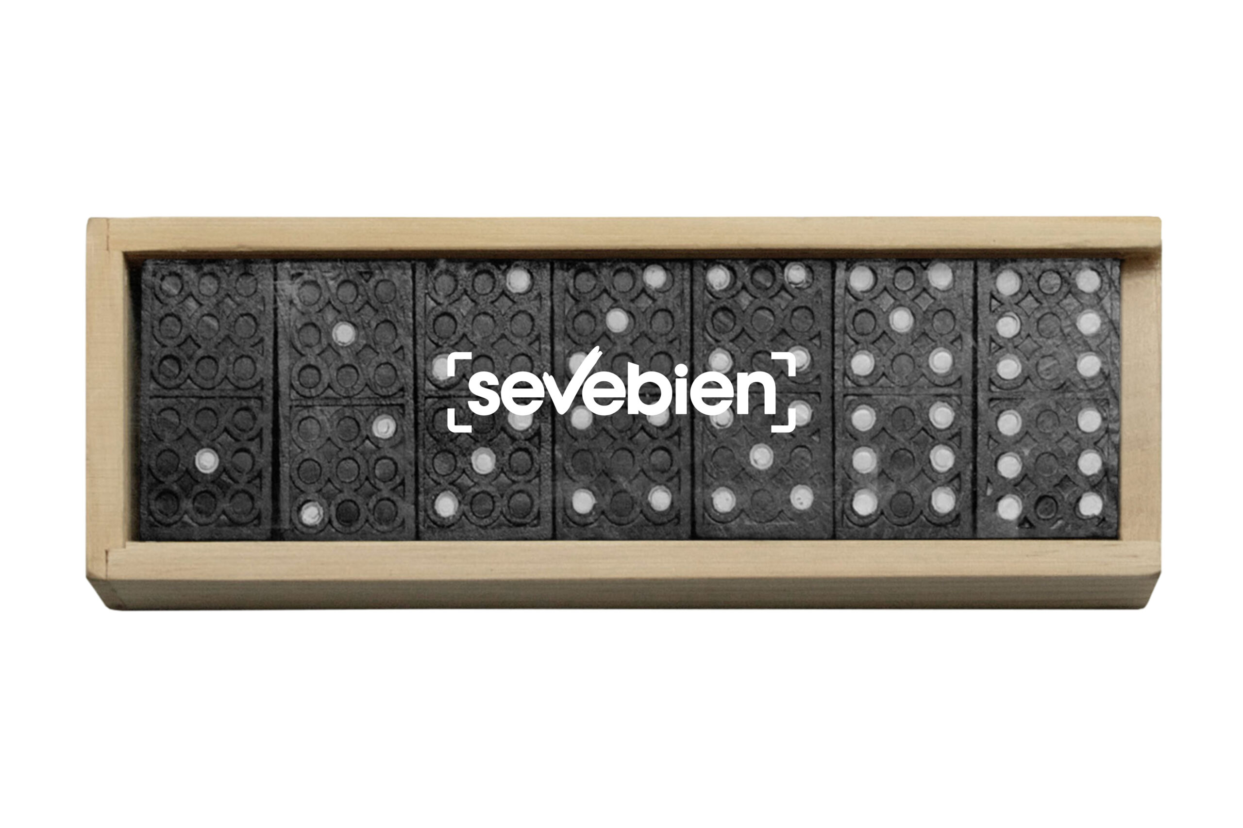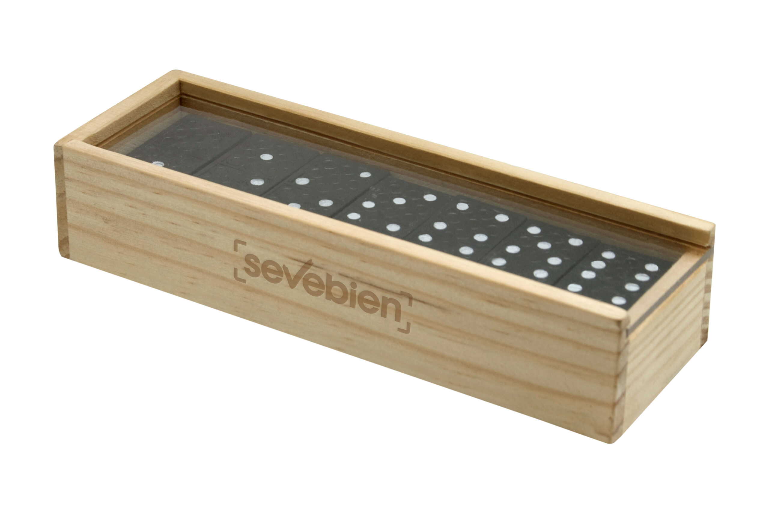15 x 5 x 3 cm. Madera y plástico. Juego de dominó con 28 piezas de madera pintadas de negro, caja de madera y tapa plástica transparente. Manual de instrucciones dentro de la caja. Presentación en caja de regalo.