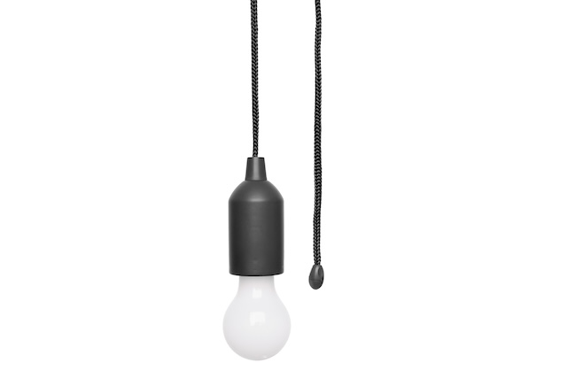 80 cm (largo del cordón). Plástico. Lampara con luz led. Contiene un lazo que al tirarlo enciende y apaga la luz de la bombilla. Utiliza 3 baterías AAA incluidas.