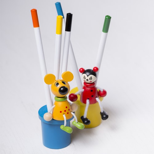 Lapicero en madera natural de alegres diseños de animalitos. Lápices no incluidos.