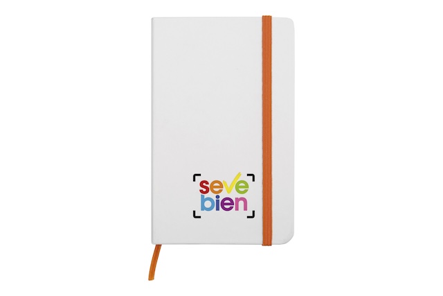 14,3 x 9,2 x 1,1 cm. Cartón. Libreta de tapa dura color blanco. Contiene 80 hojas rayadas, señalador y cierra con banda elástica del mismo color.