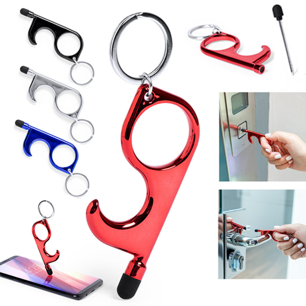 Llavero higiénico anti-contacto con bolígrafo y puntero integrados. Fabricado en resistente ABS de acabado metalizado y disponible en variada gama de colores. Especialmente diseñado para evitar tocar con las manos superficies de uso común (manivelas de puertas, interruptores, grifos de uso público, cajeros automáticos…). Con cómodo troquel para el dedo y presentado en bolsa individual de diseño. Recomendado para marcaje en tampografía. Bolígrafo Puntero Incluido