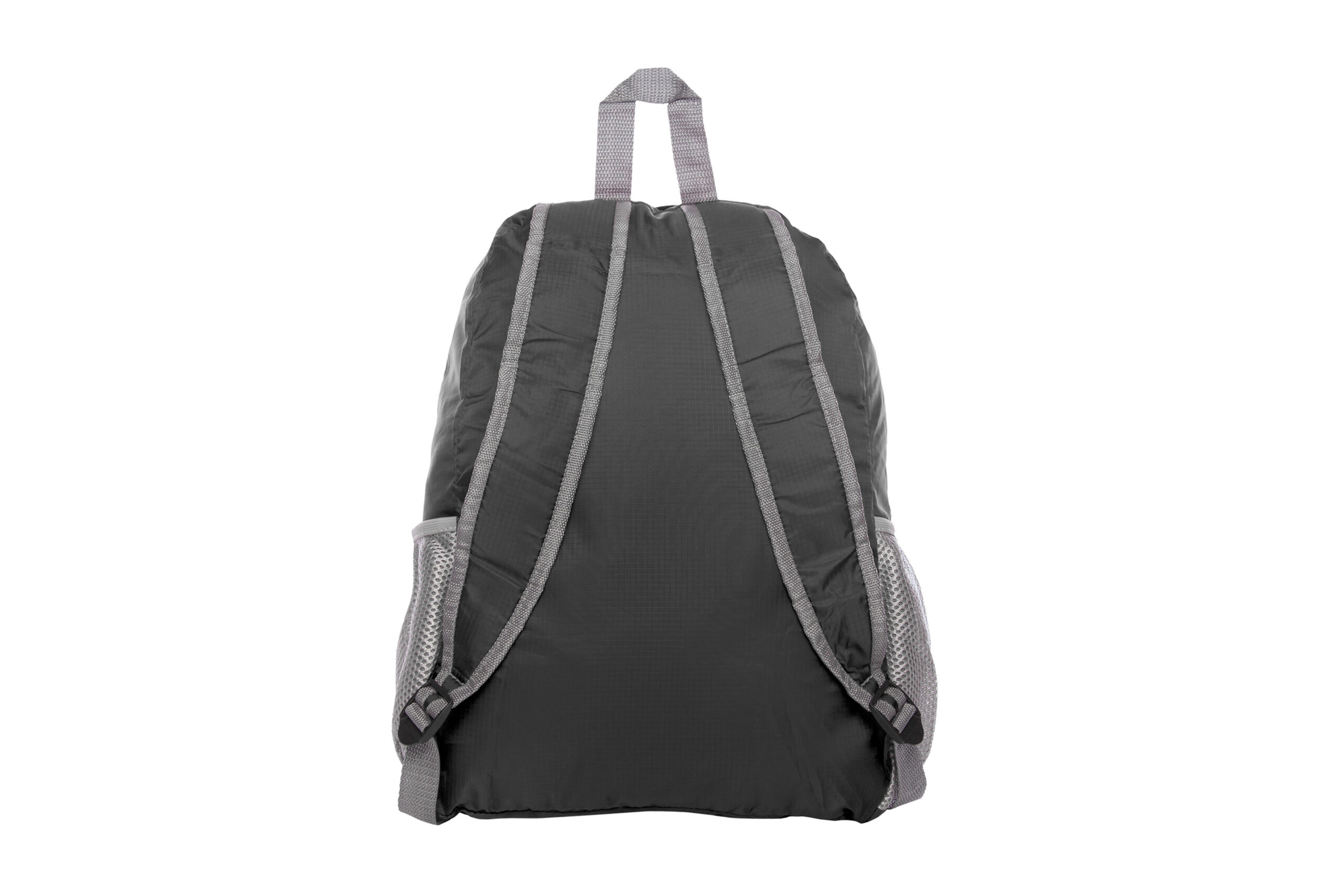 25 x 40 x 15,5 cm. (abierta). 23 x 13 x 2,5 cm (cerrada). Capacidad 12,5 litros aprox. Ripstop 210T (Tela ligera y resistente, de alta durabiidad y protección antidesgarro). Mochila plegable. Bolsillos laterales de red en color gris con tiras amarillas reflectivas en ambos lados. Detalles en gris en la manija y el cierre.