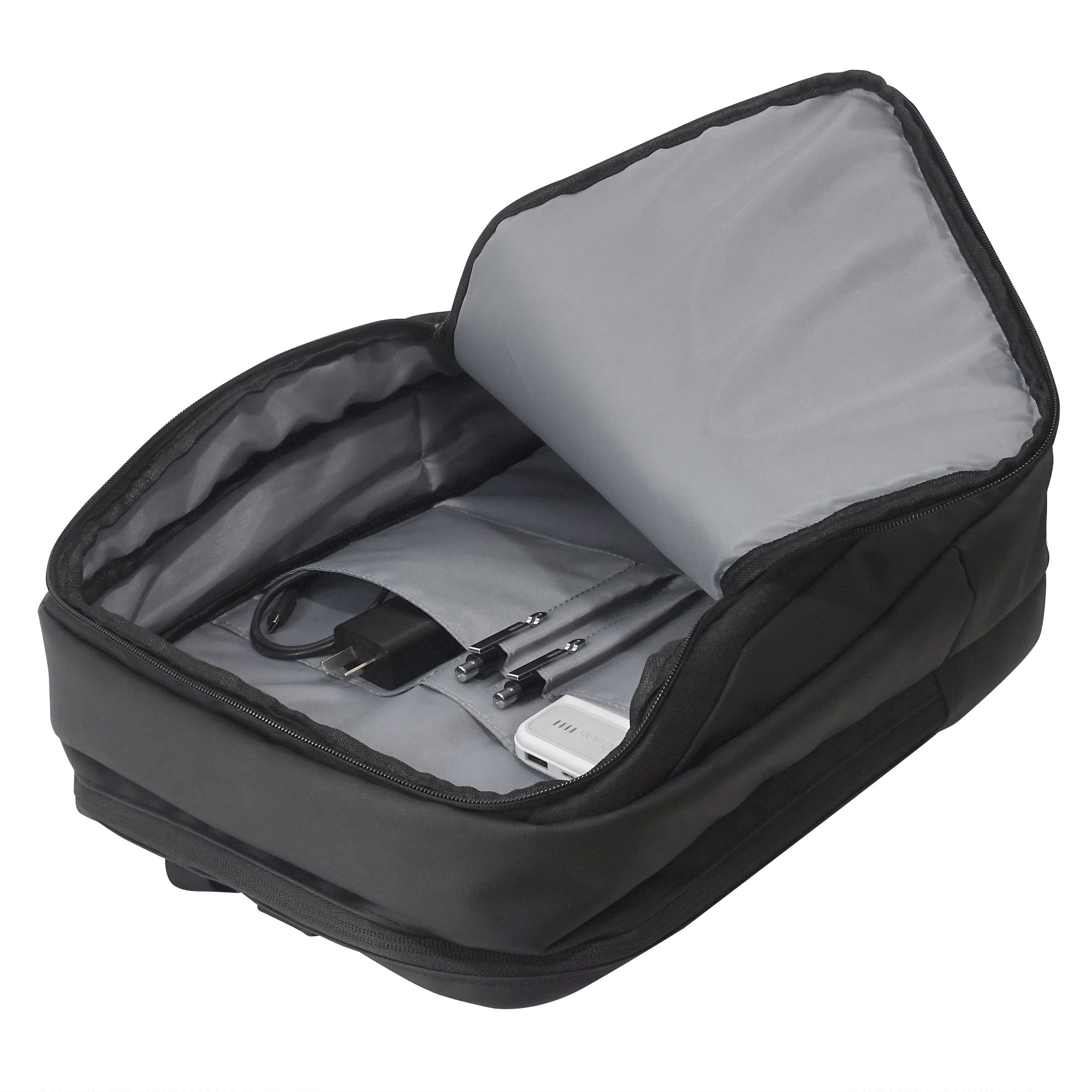 31 x 42 x 15 cm. Capacidad 17 litros. Poliéster 300D. Mochila Portanotebook de 14 “. Compartimento con espacio para notebook, bolsillo para tablet. En el frente bolsillo con cierre y detalles en PU. Espalda acolchada con red que permite ventilación y cuenta también con 1 bolsillo de seguridad con cierre. Correas acolchadas y cierres metálicos. Todo el contorno de la mochila y las correas, están forradas en poliéster recubierto con una película de PU. Presencia de marca en una de sus correas y en el interior.