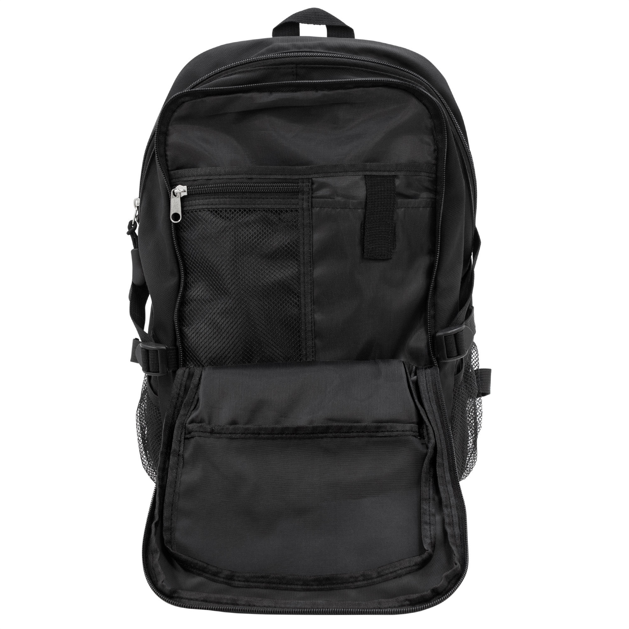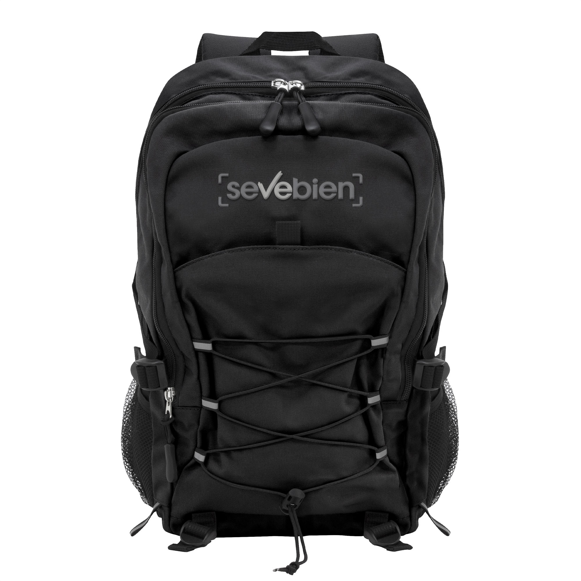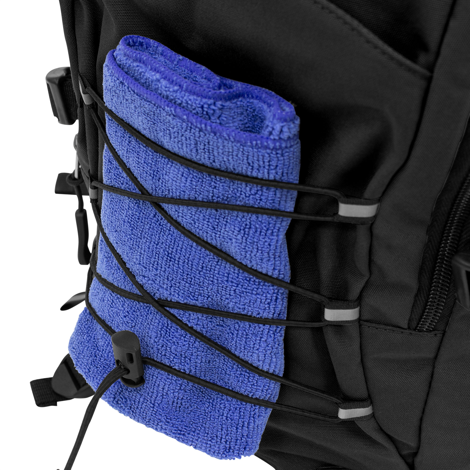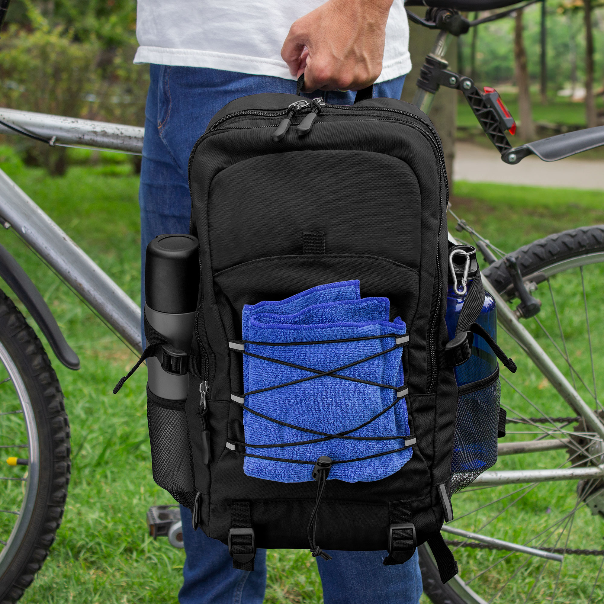 28 x 41 x 17 cm Capacidad 19 litros. Algodón y Poliester. Mochila outdoor. Múltiples espacios para transportar objetos. Compartimento principal con bolsillo elastizado. Bolsillo frontal con cierre, cordón elástico cruzado ajustable y dos bolsillos de red laterales y cintas de amarre. Detalles reflectivos. Cierres metálicos con tiradores de goma. Correas regulables y espalda acolchadas.