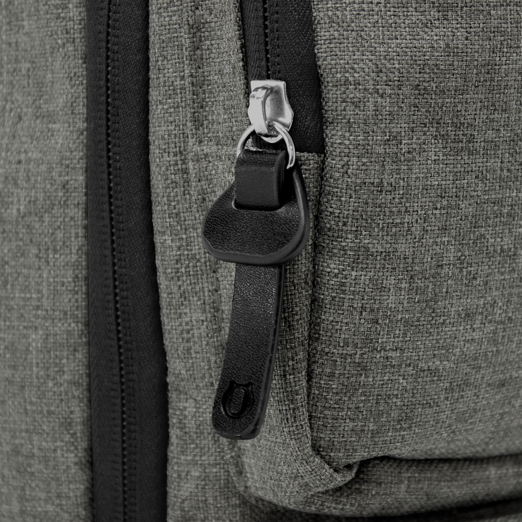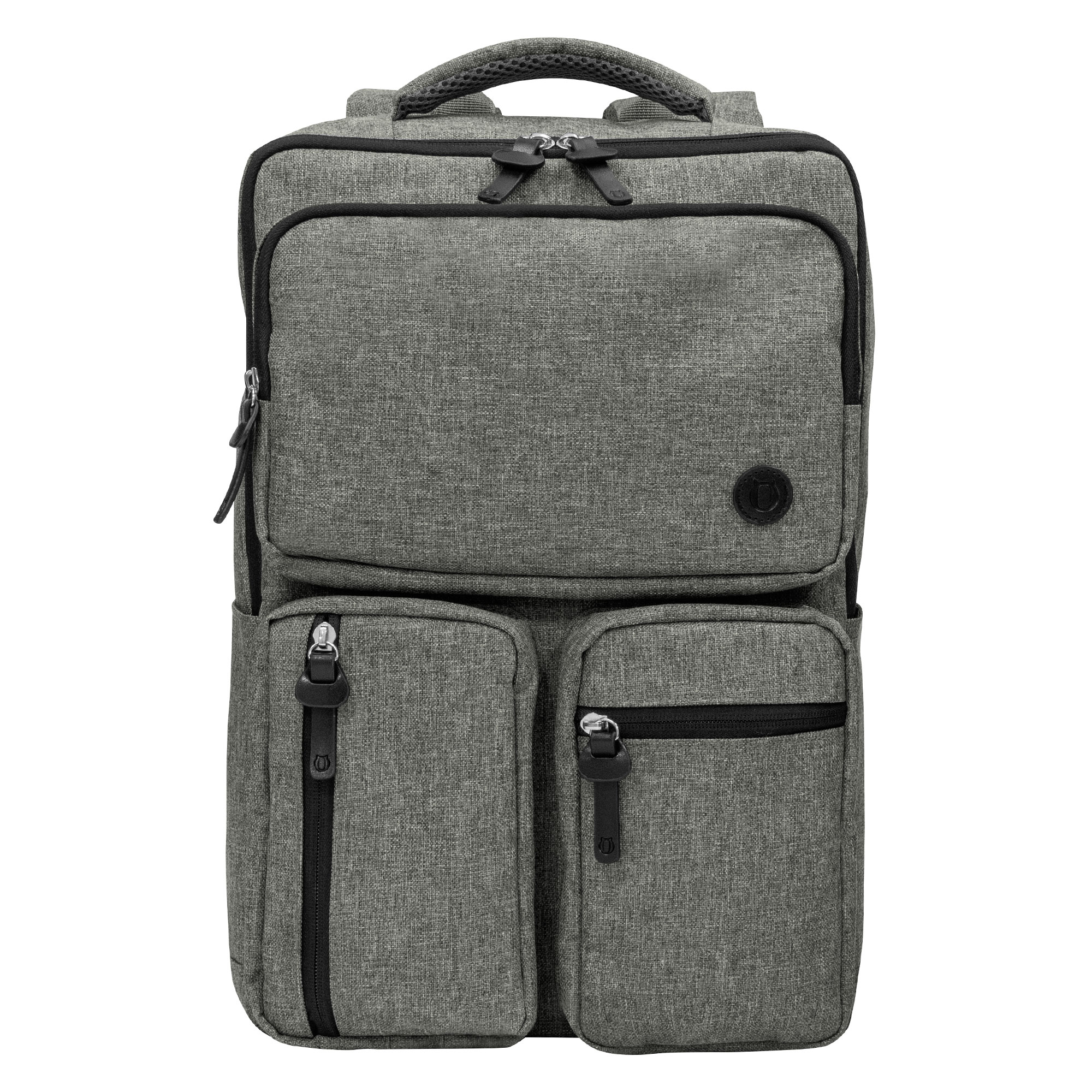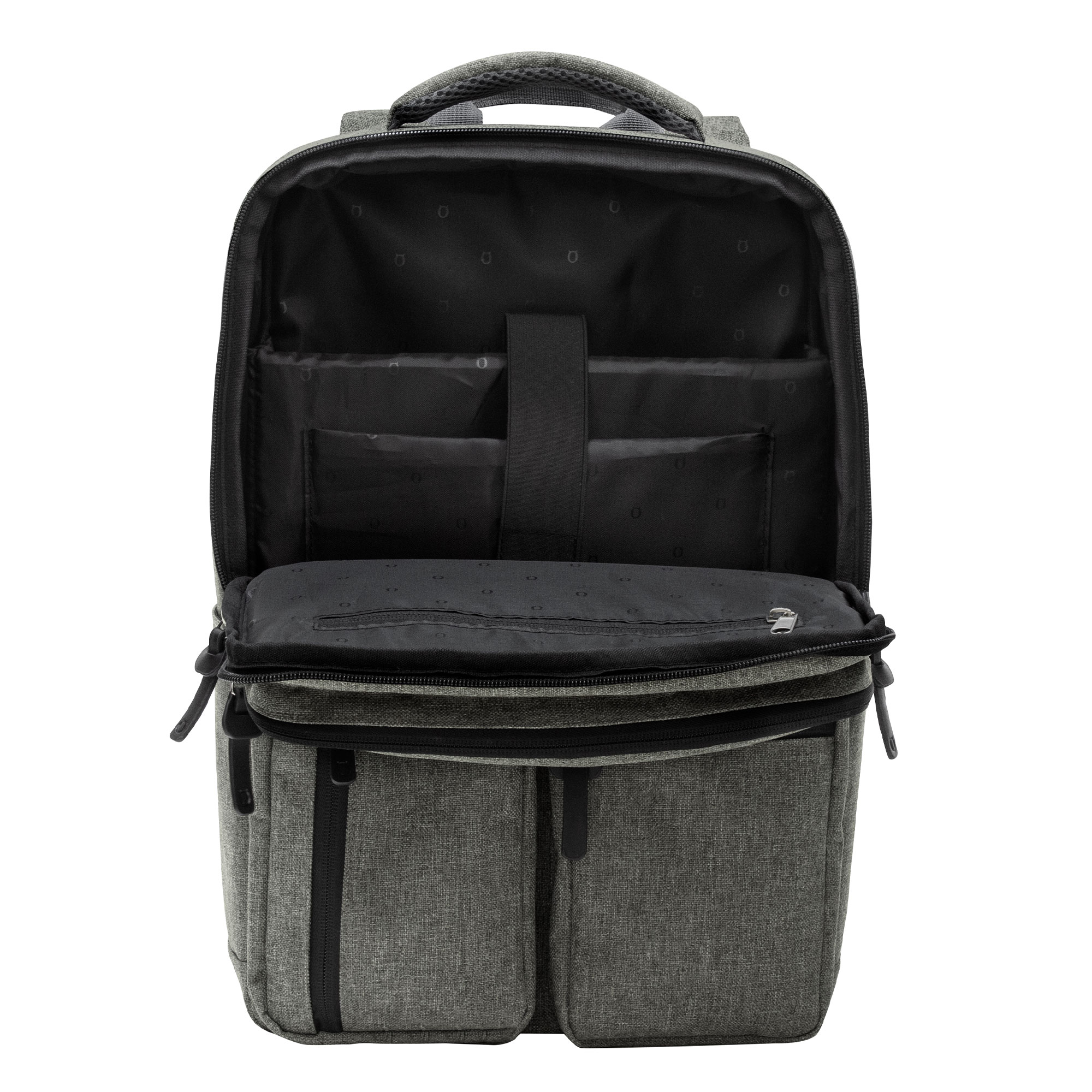 27 x 41 x 10 cm. Capacidad 12 litros. Poliéster 600D Bicolor + Nylon + Poliuretano. Mochila portanotebook de hasta 15,6 pulgadas. Compartimento principal con bolsillos acolchados para notebook y tablet con cinta elástica de velcro. 3 bolsillos delanteros con cierre y 2 bolsillos laterales. Manija y correas acolchadas, hebillas plásticas y cierres metálicos con tiradores en poliuretano. Espalda acolchada. Incluye tira para sujetar la mochila en la manija extensible de un equipaje de mano.