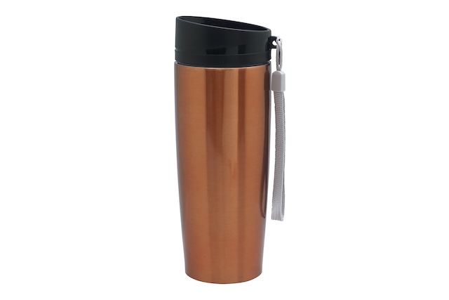Ø 6 x 19,5 cm. Capacidad 350 ml.  Acero inoxidable. Mug doble pared Interior acero 304 y exterior acero 201. Tapa a rosca, botón para abrir y cerrar. Lazo para sujetar en la muñeca. Base antideslizante. Mantiene las bebidas frías o calientes por más tiempo. Presentación en caja de regalo.